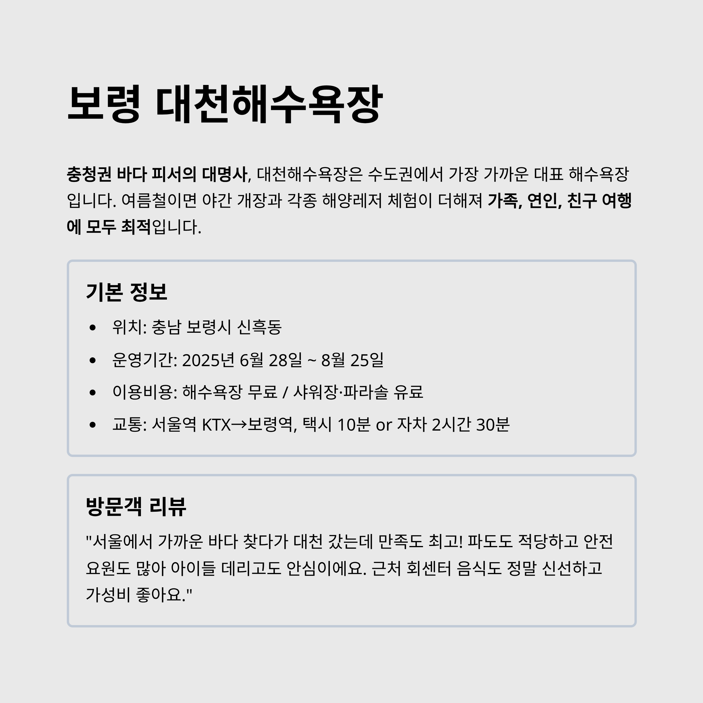 | 교통 | 서울역 KTX→보령역, 택시 10분 or 자차 2시간 30분 |