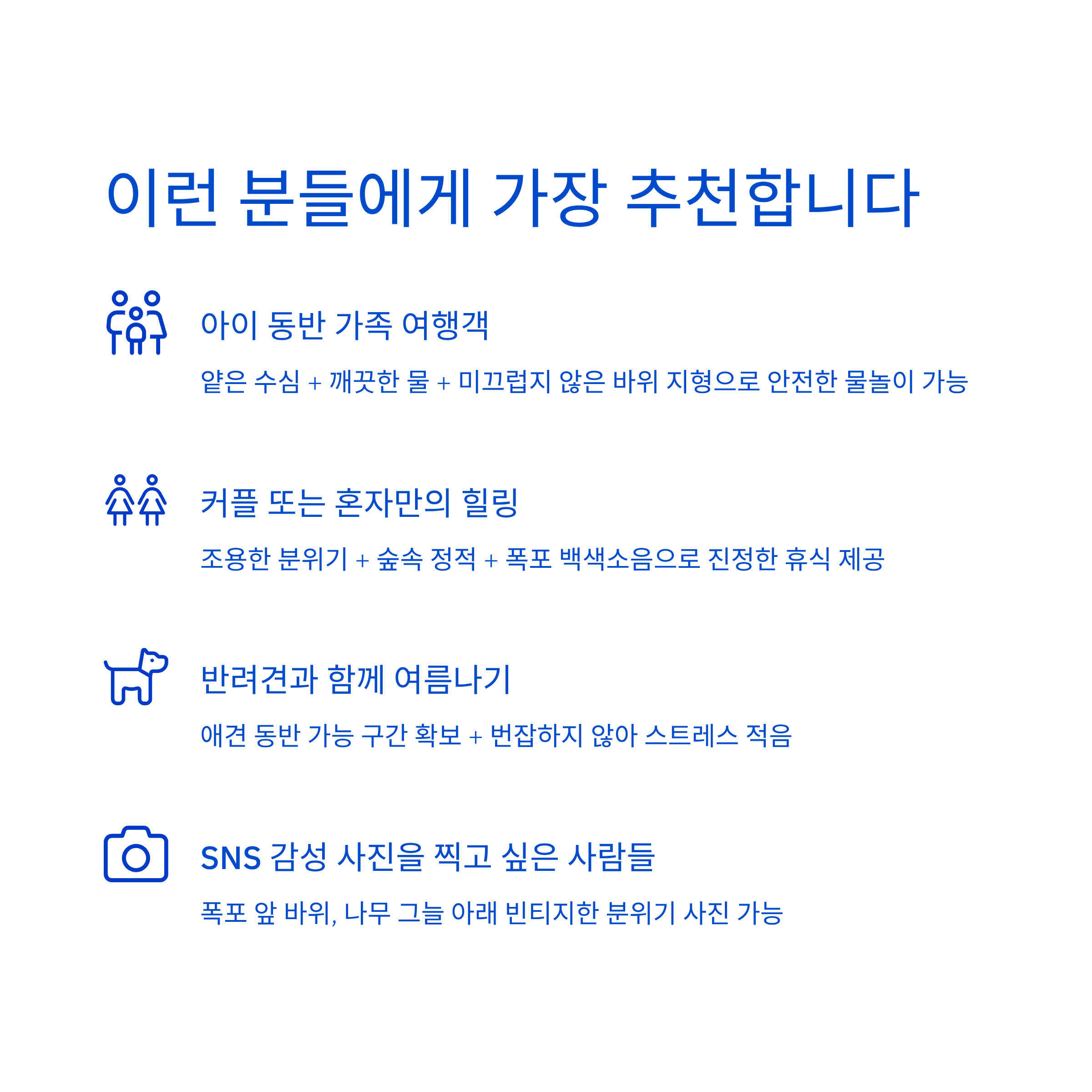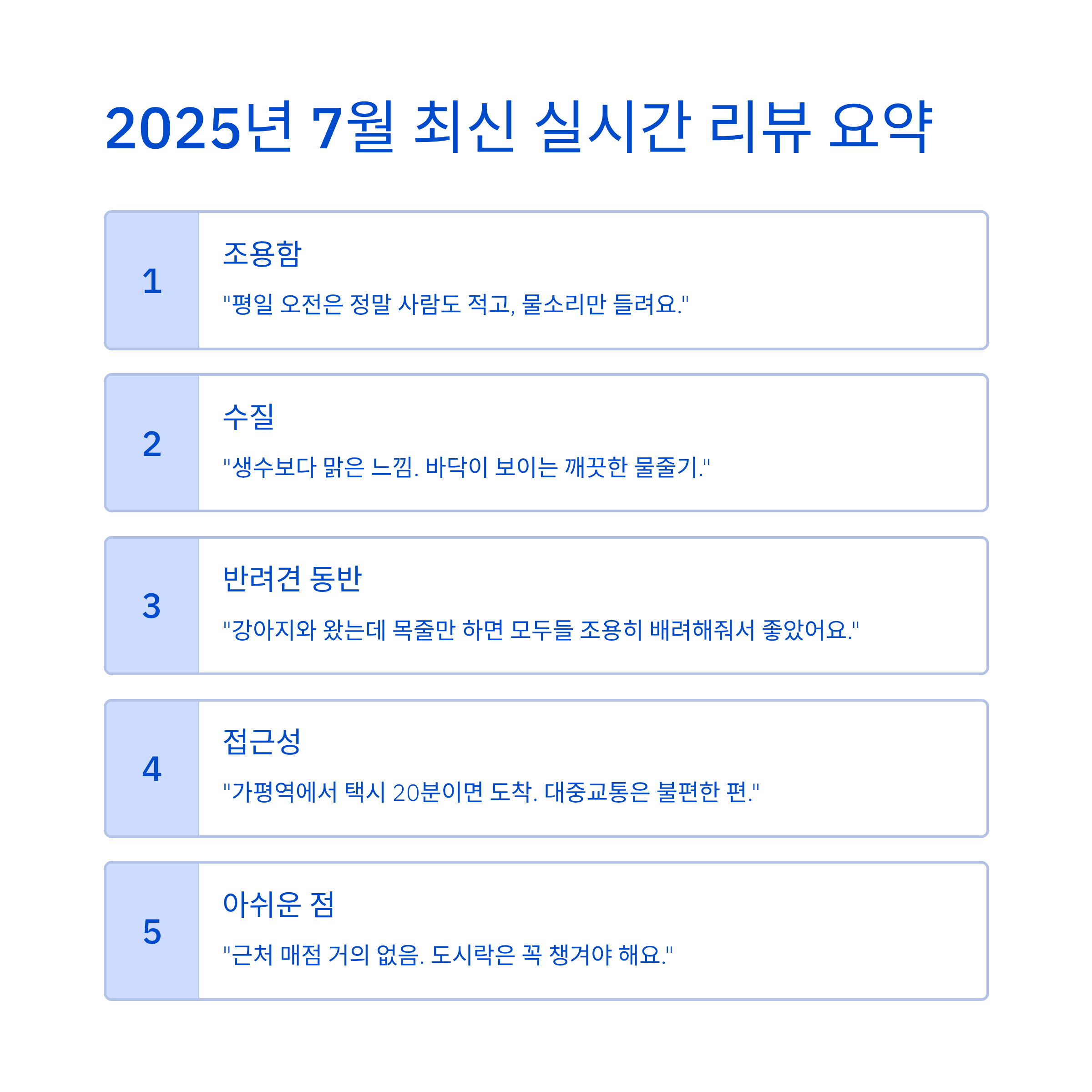 | 조용함 | “평일 오전은 정말 사람도 적고, 물소리만 들려요.” |