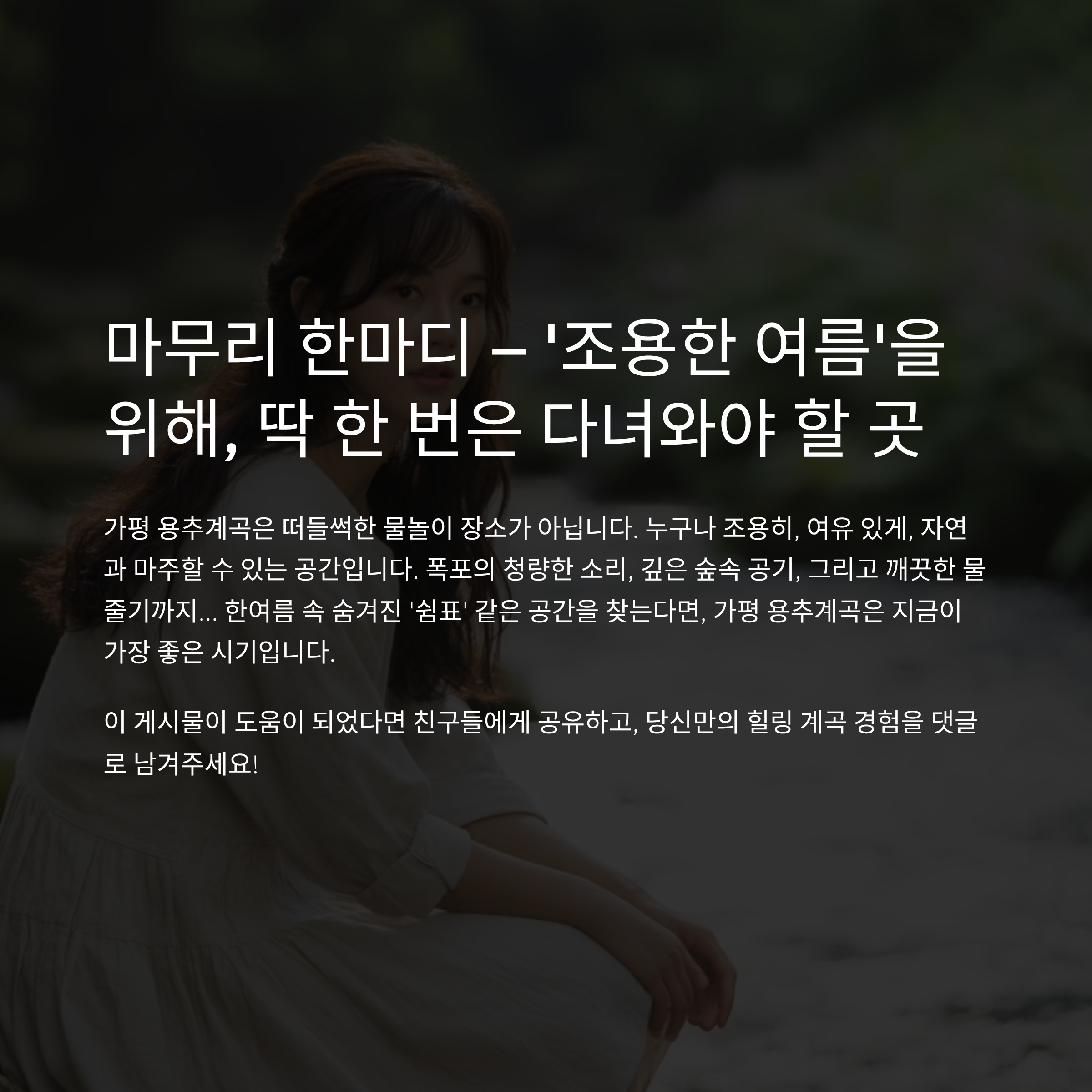 7월 말 한여름. 유명 계곡은 이미 인파와 소음으로 가득합니다. 하지만 피서가 꼭 사람에 치이고 시끄러운 곳이어야 할까요? 경기도 가평의 깊은 숲 속에 자리한 **‘용추계곡’**은 여전히 고요하고, 여전히 맑고, 여전히 숨겨져 있는 힐링 계곡입니다. 이번 포스팅은 2025년 7월 최신 현장 리뷰와 함께, 소비자 입장에서 여행 준비부터 체크포인트, 주차 팁, 근처 추천 숙소까지 전부 담은 실전형 계곡 여행 완성본입니다. ‘조용한 여름’을 진짜로 찾고 있다면 지금 이 글을 끝까지 읽어보세요.