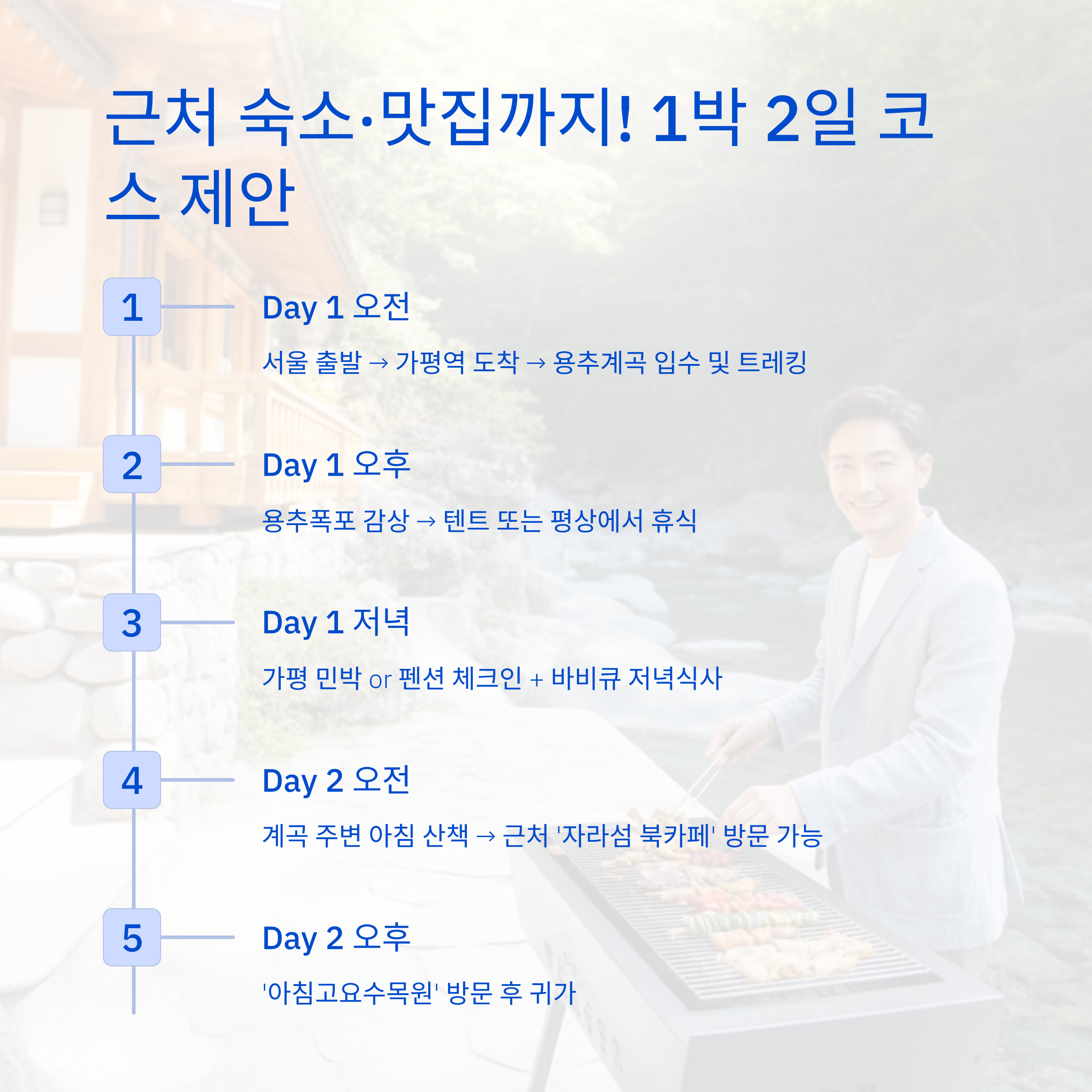 | Day 1 저녁 | 가평 민박 or 펜션 체크인 + 바비큐 저녁식사 |