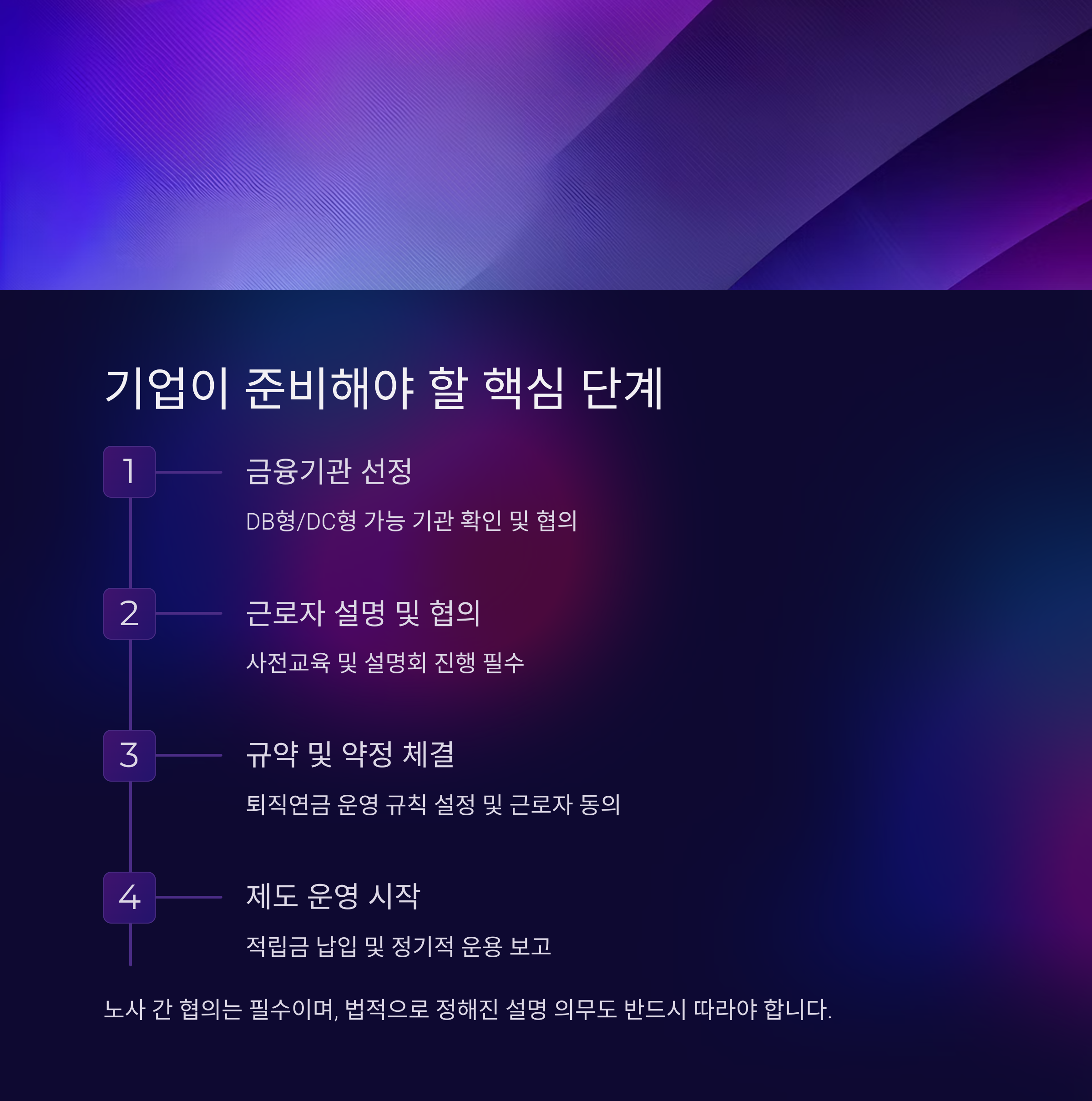 | 규약 및 약정 체결 | 퇴직연금 운영 규칙 설정 및 근로자 동의 |