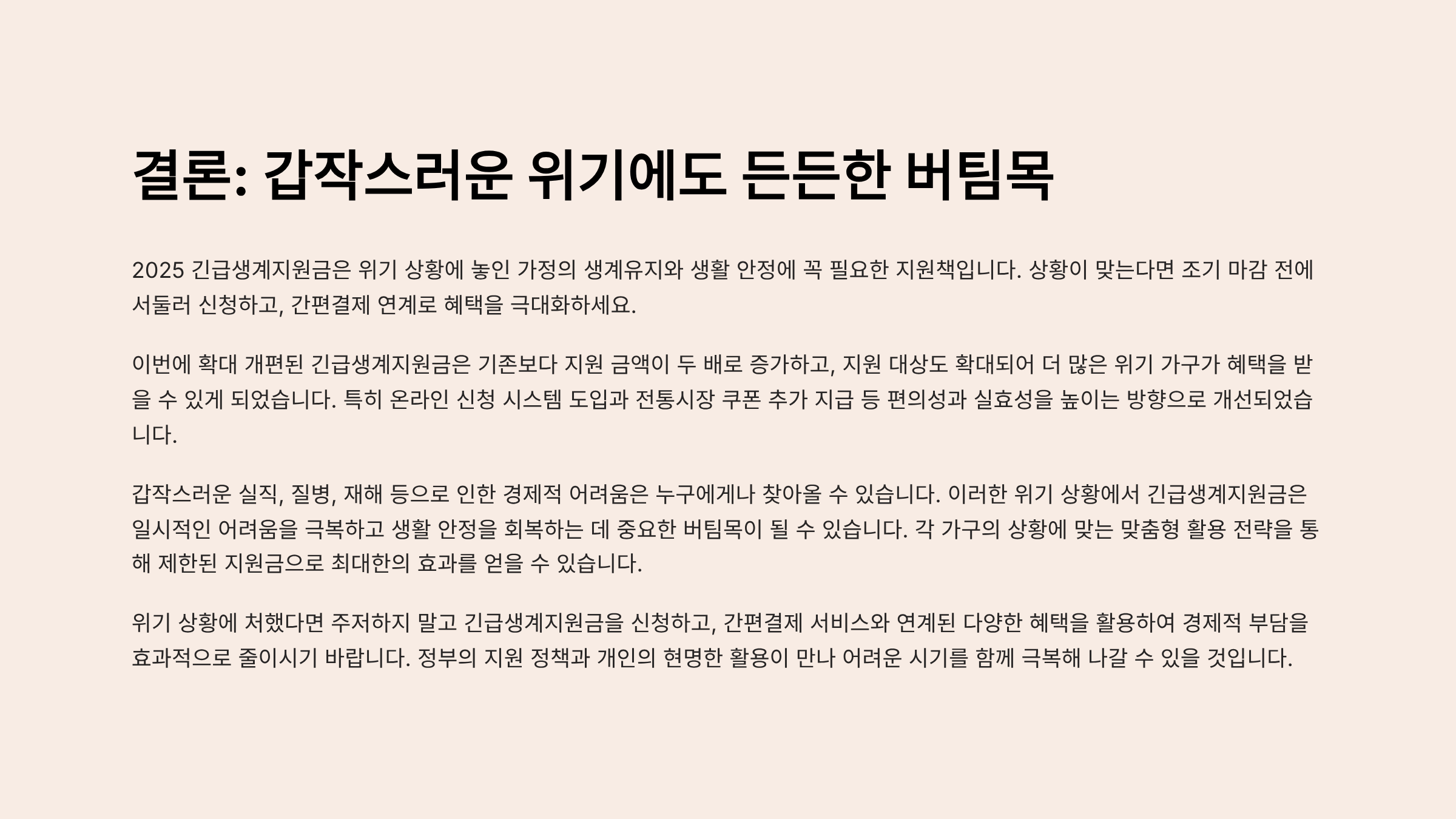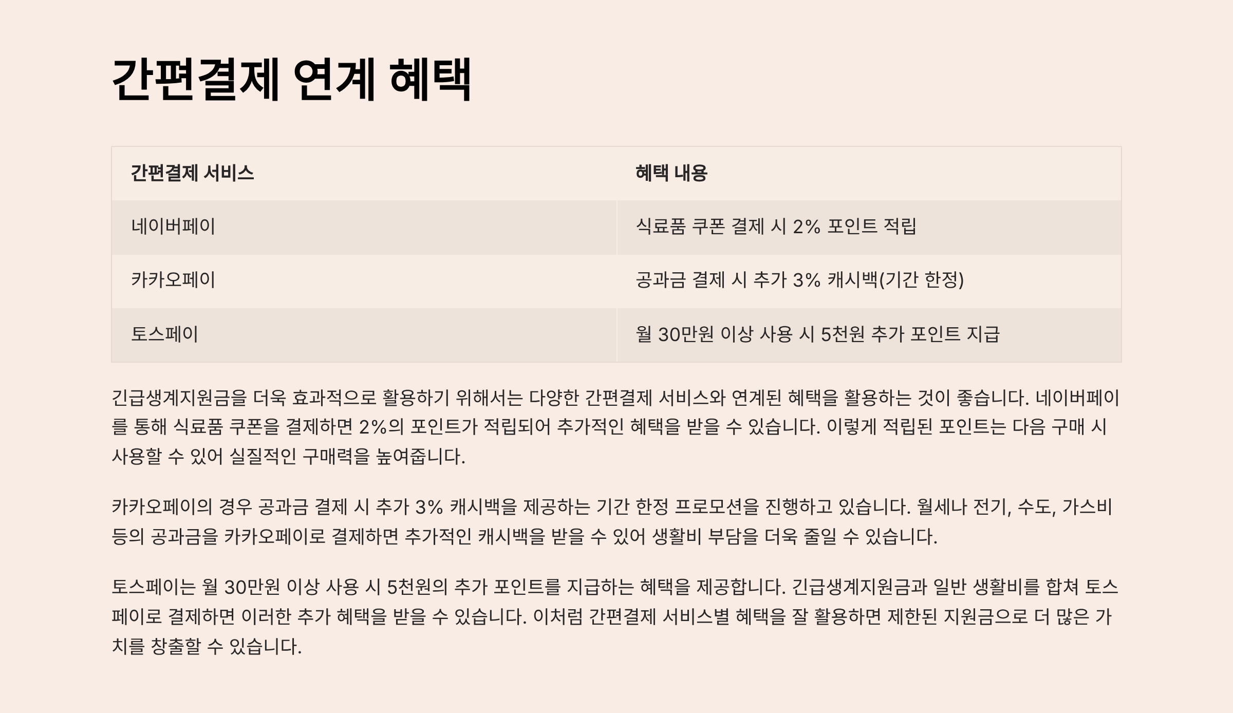 2025 긴급생계지원금은 위기 상황에 놓인 가정의 생계유지와 생활 안정에 꼭 필요한 지원책입니다. 상황이 맞는다면 조기 마감 전에 서둘러 신청하고, 간편결제 연계로 혜택을 극대화하세요.