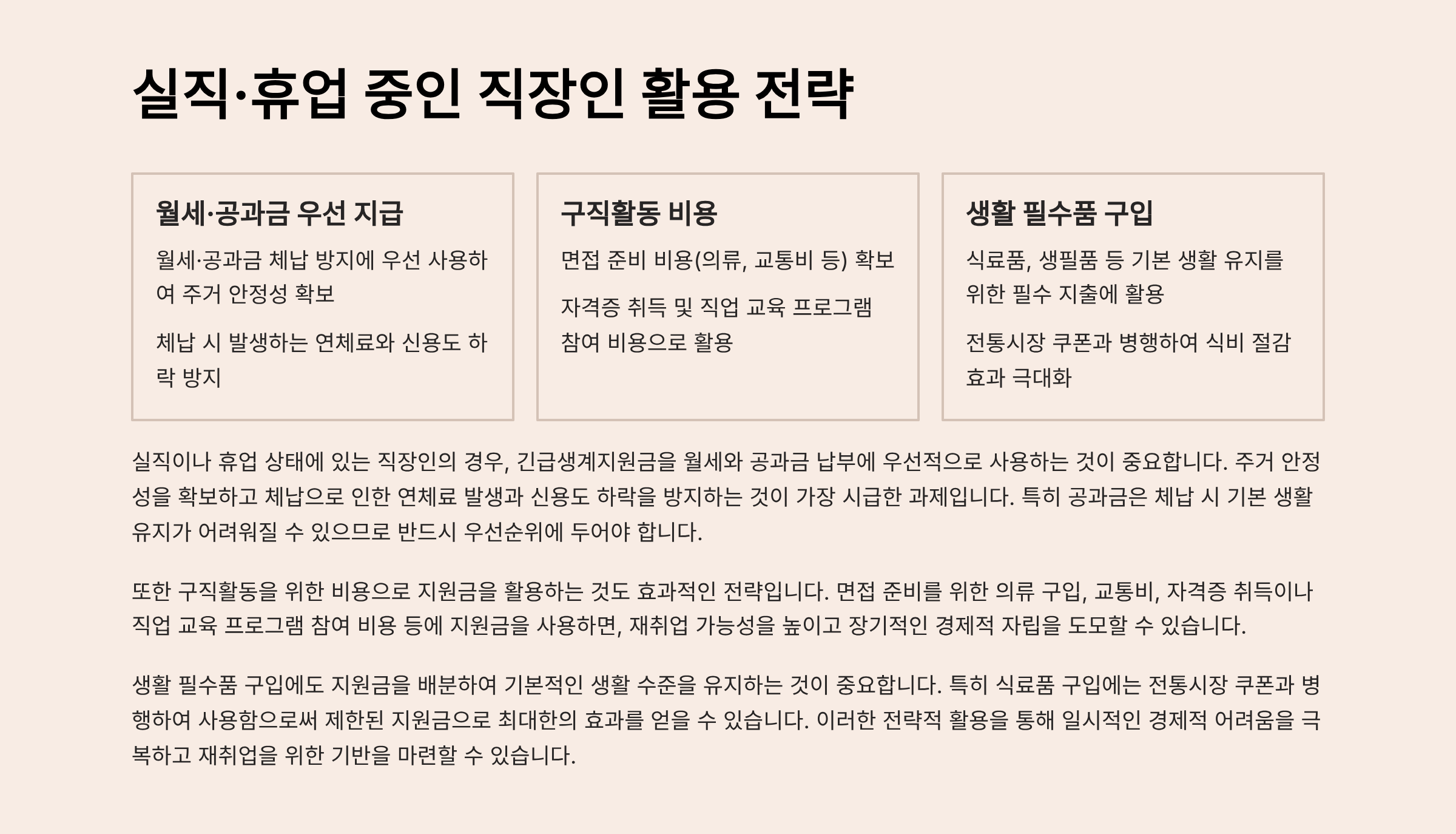- 긴급한 생계자금 마련 후 구직활동 재개