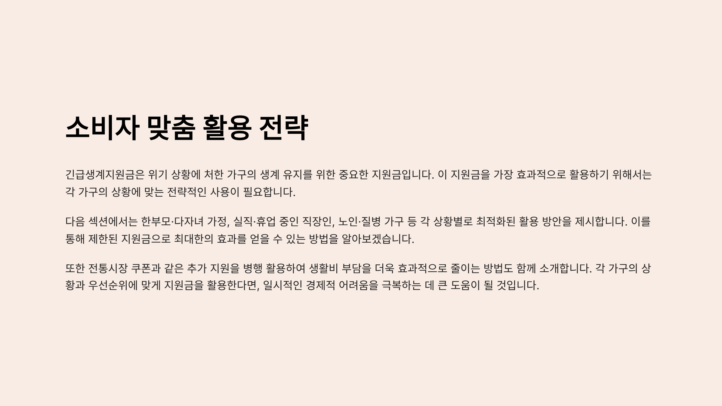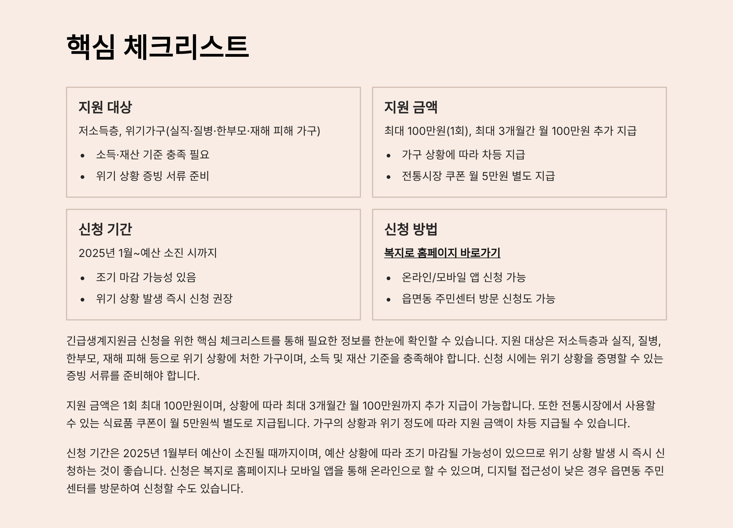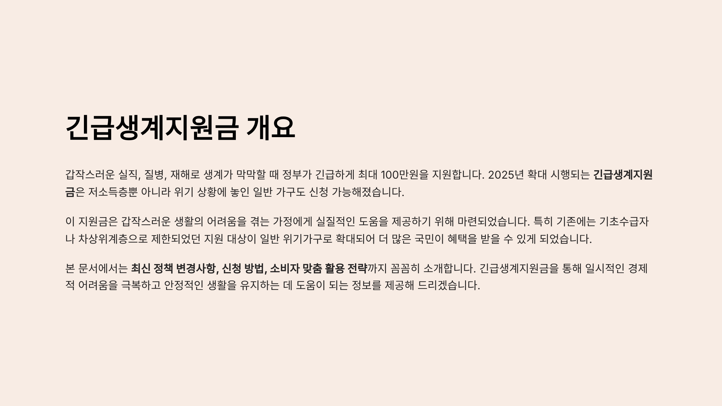 갑작스러운 실직, 질병, 재해로 생계가 막막할 때 정부가 긴급하게 최대 100만원을 지원합니다. 2025년 확대 시행되는 긴급생계지원금은 저소득층뿐 아니라 위기 상황에 놓인 일반 가구도 신청 가능해졌습니다. 이번 글에서는 최신 정책 변경사항, 신청 방법, 소비자 맞춤 활용 전략까지 꼼꼼히 소개합니다.