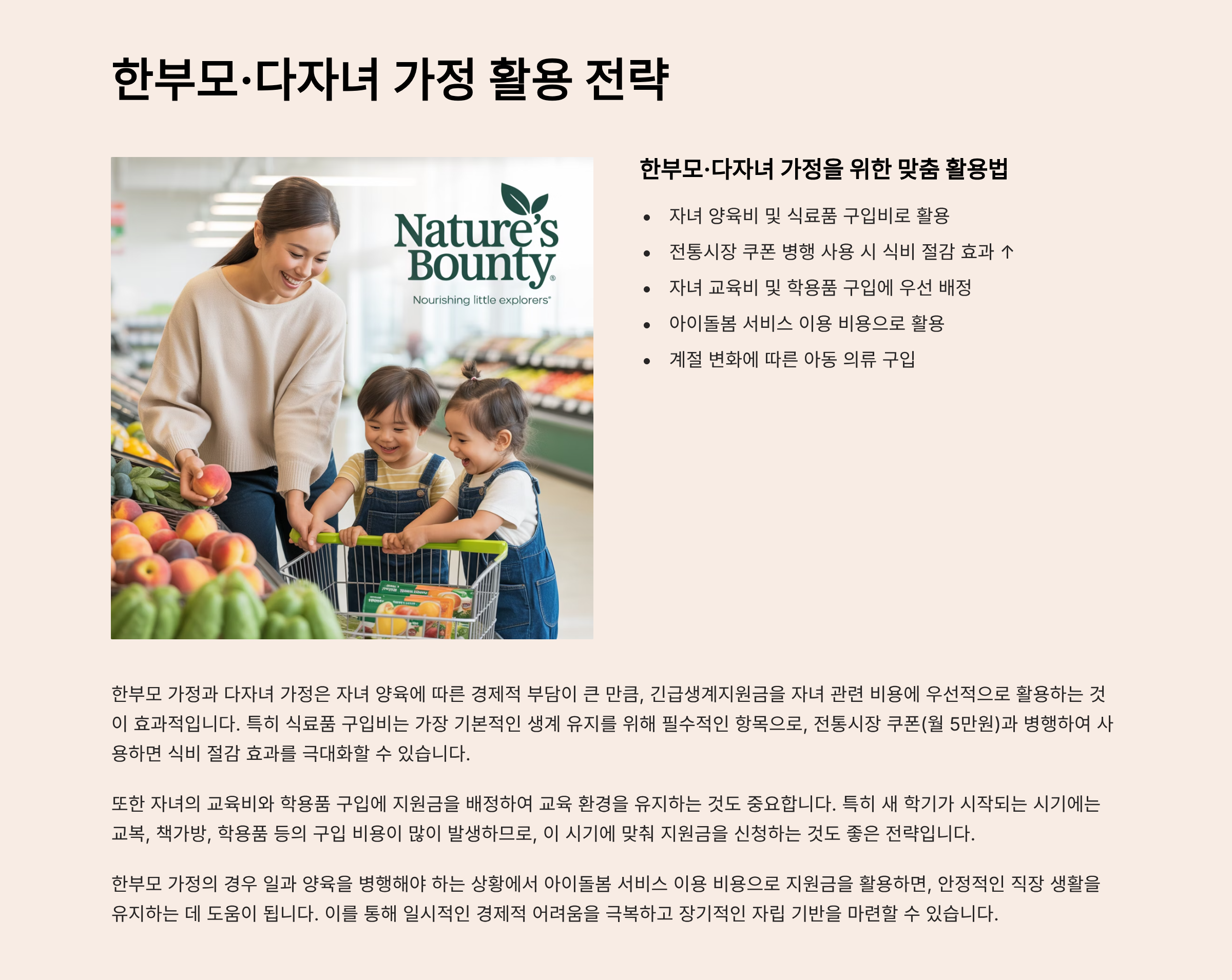 | 추가 지원 | 없음 | 전통시장·마트 식료품 쿠폰 추가 지급(월 5만원) |