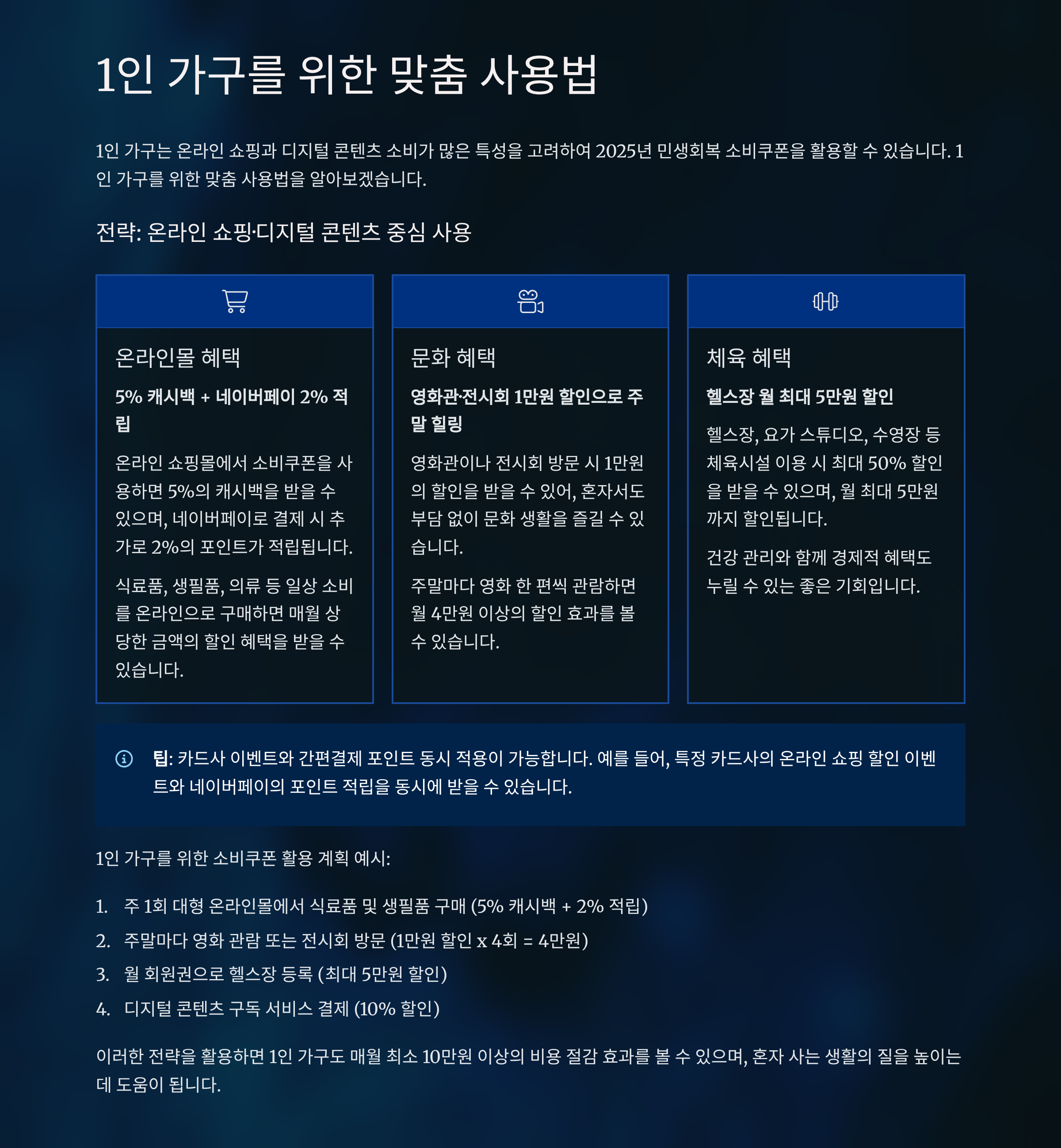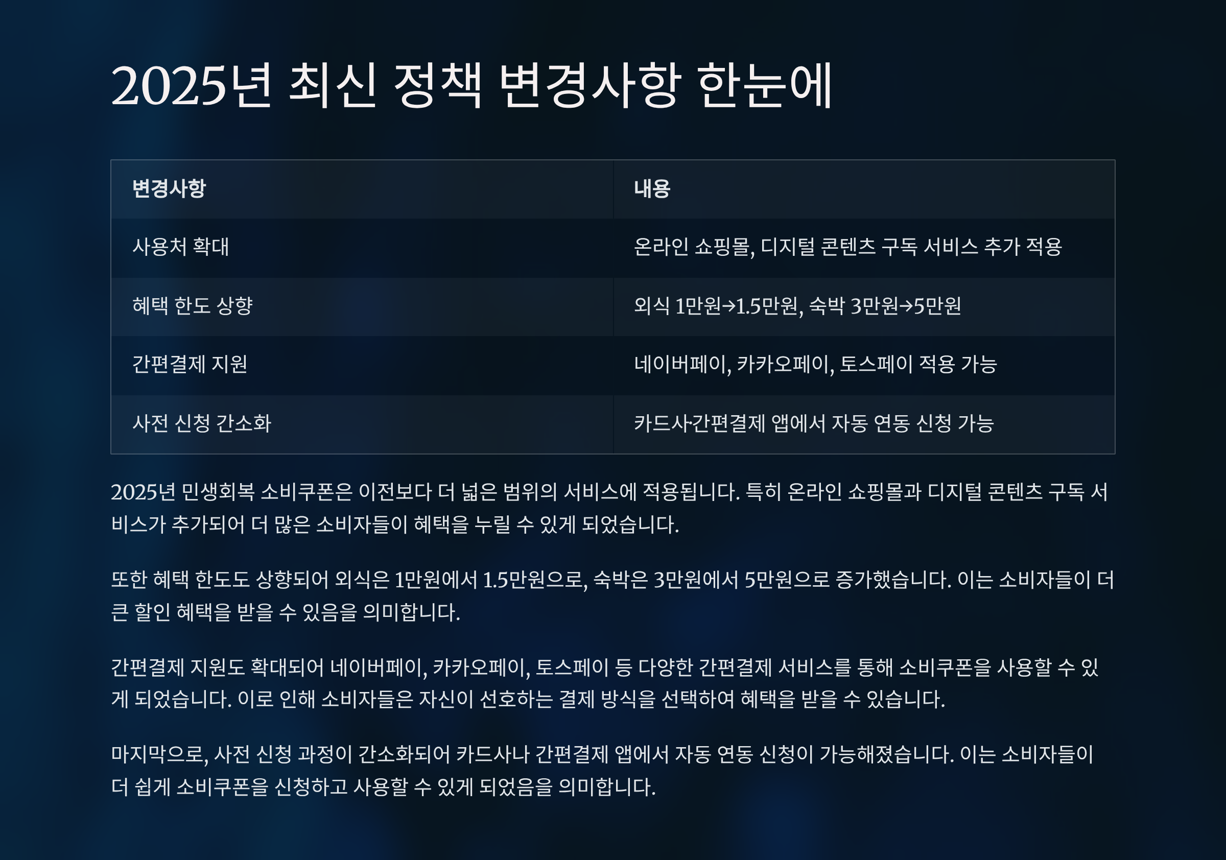 2025년 민생회복 소비쿠폰은 외식·문화·체육·여행을 넘어 온라인 쇼핑과 디지털 콘텐츠까지 확장되며 혜택이 더 커졌습니다. 이번 글에서는 최신 정책 변경사항, 간편결제 사용 시 혜택, 그리고 소비자 유형별(가족·1인 가구·직장인) 맞춤 사용법까지 포함한 초프리미엄 가이드를 준비했습니다.