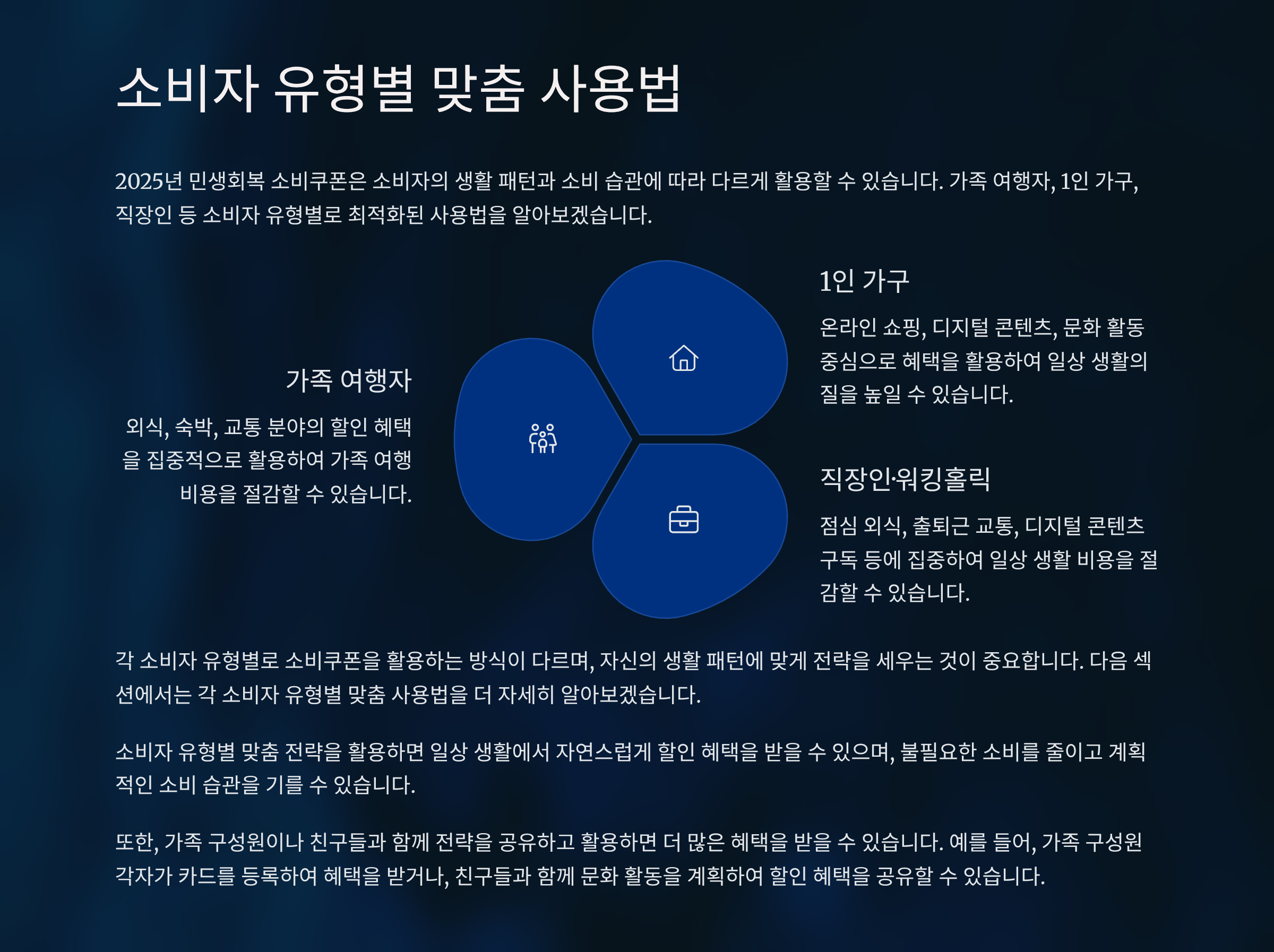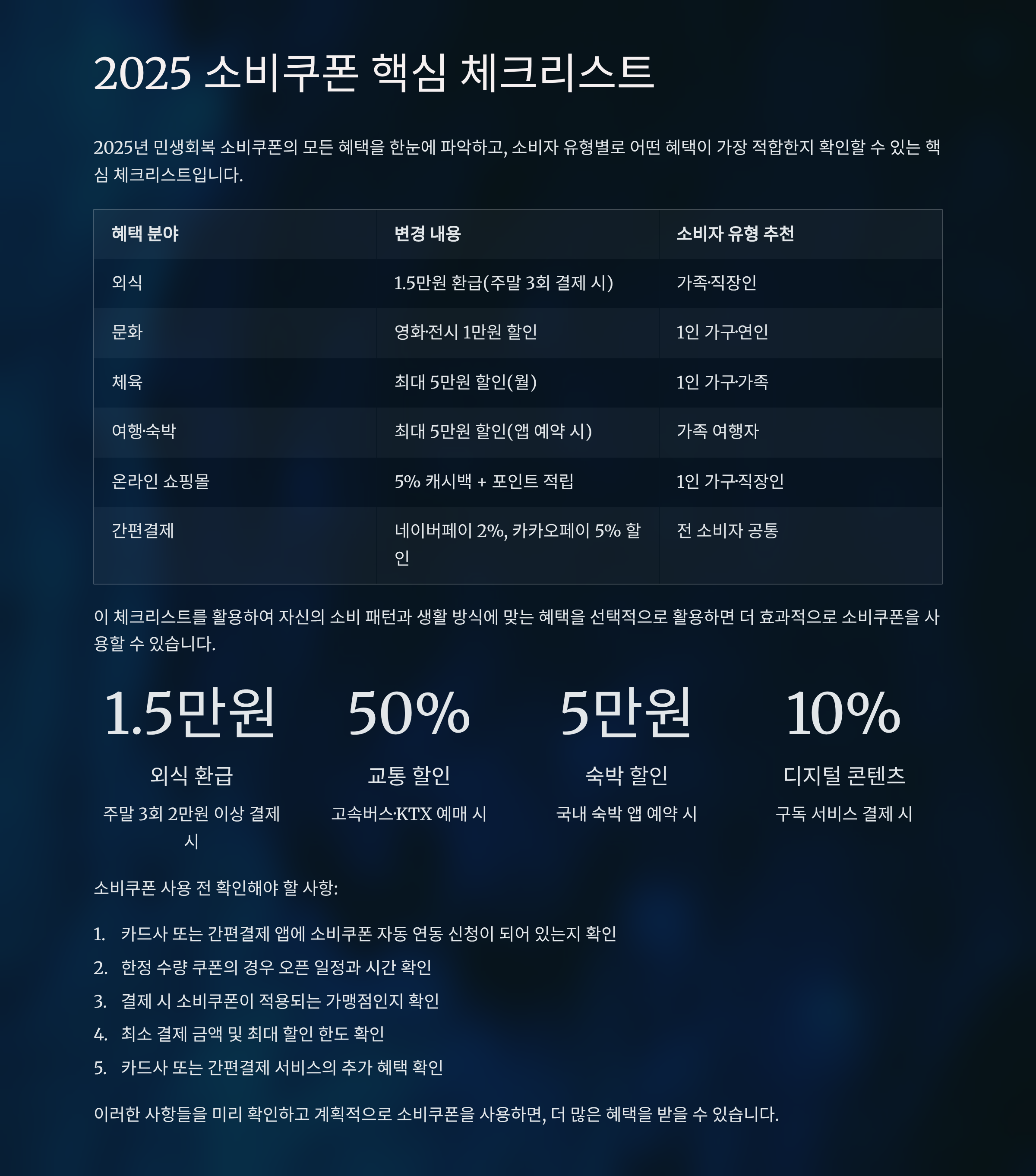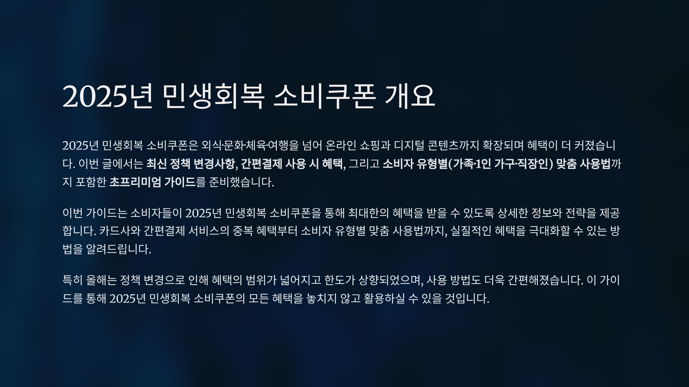 2025년 민생회복 소비쿠폰은 외식·문화·체육·여행을 넘어 온라인 쇼핑과 디지털 콘텐츠까지 확장되며 혜택이 더 커졌습니다. 이번 글에서는 최신 정책 변경사항, 간편결제 사용 시 혜택, 그리고 소비자 유형별(가족·1인 가구·직장인) 맞춤 사용법까지 포함한 초프리미엄 가이드를 준비했습니다.