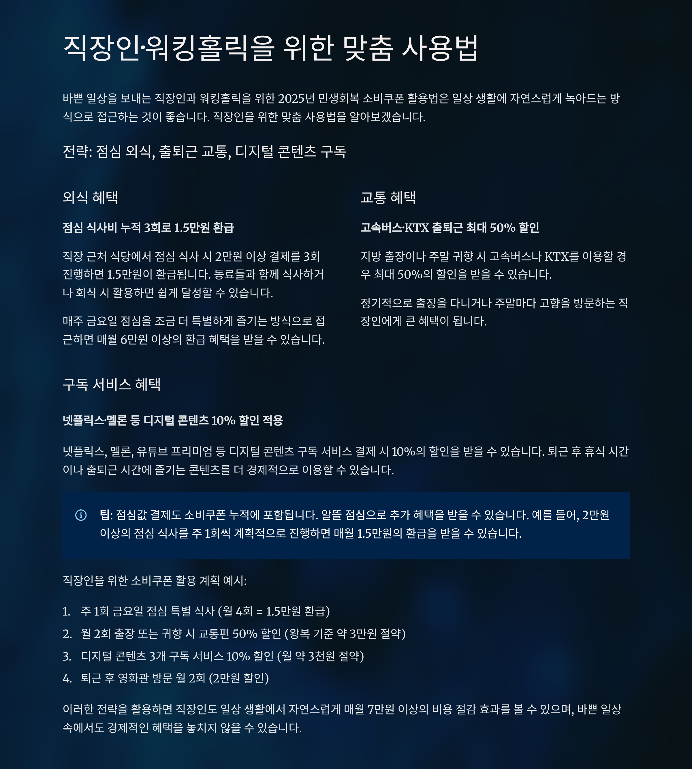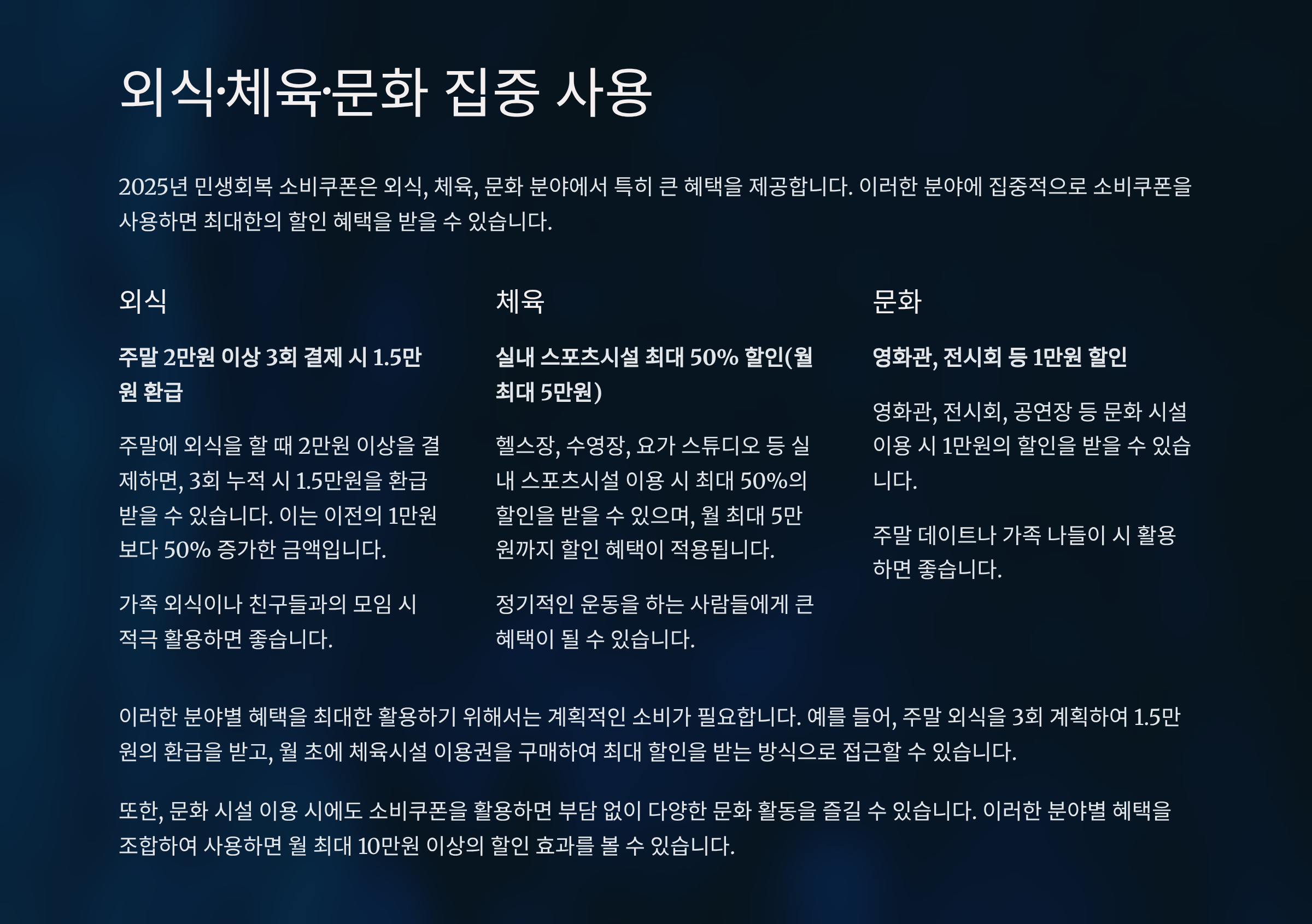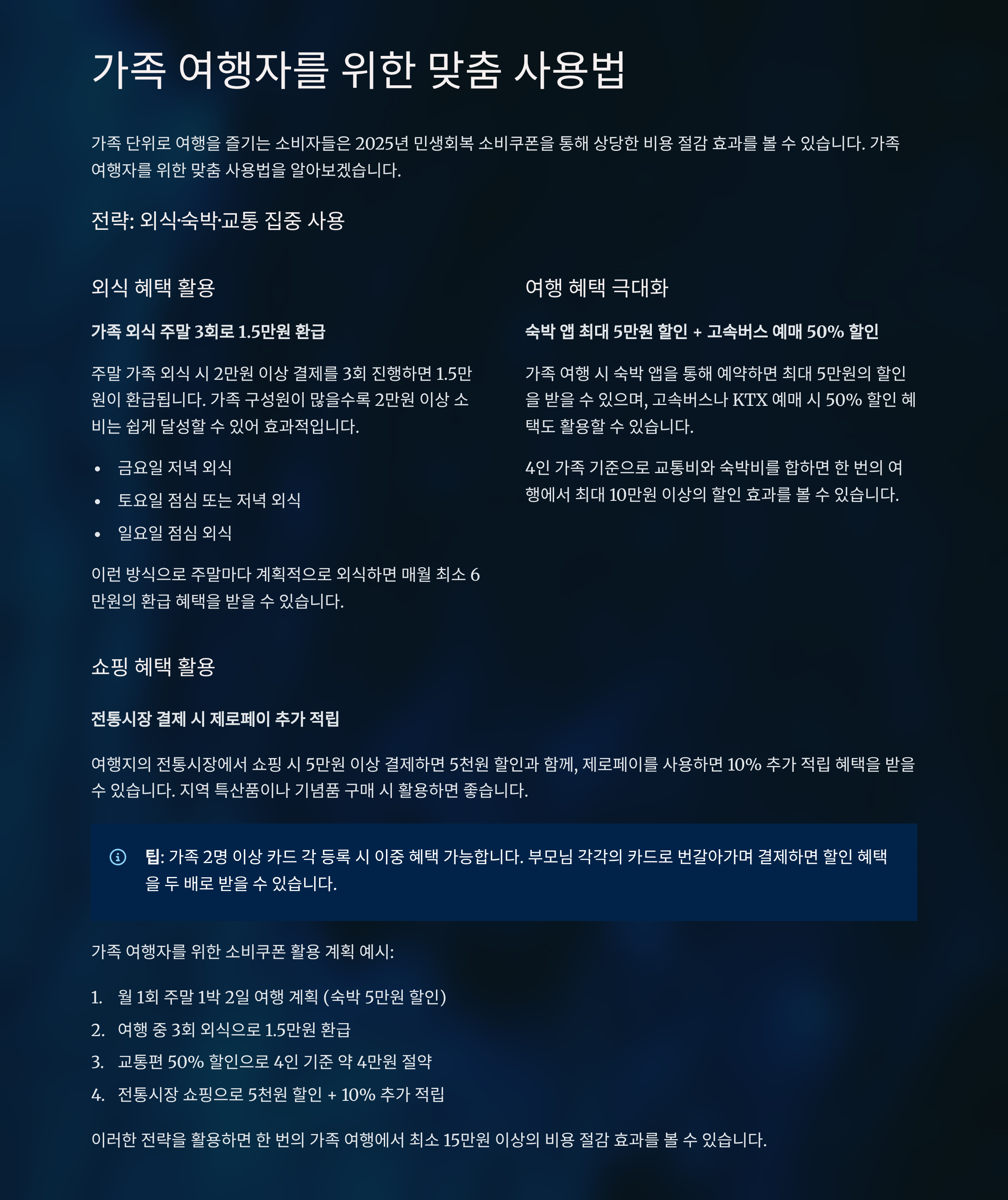 2025년 민생회복 소비쿠폰은 외식·문화·체육·여행을 넘어 온라인 쇼핑과 디지털 콘텐츠까지 확장되며 혜택이 더 커졌습니다. 이번 글에서는 최신 정책 변경사항, 간편결제 사용 시 혜택, 그리고 소비자 유형별(가족·1인 가구·직장인) 맞춤 사용법까지 포함한 초프리미엄 가이드를 준비했습니다.