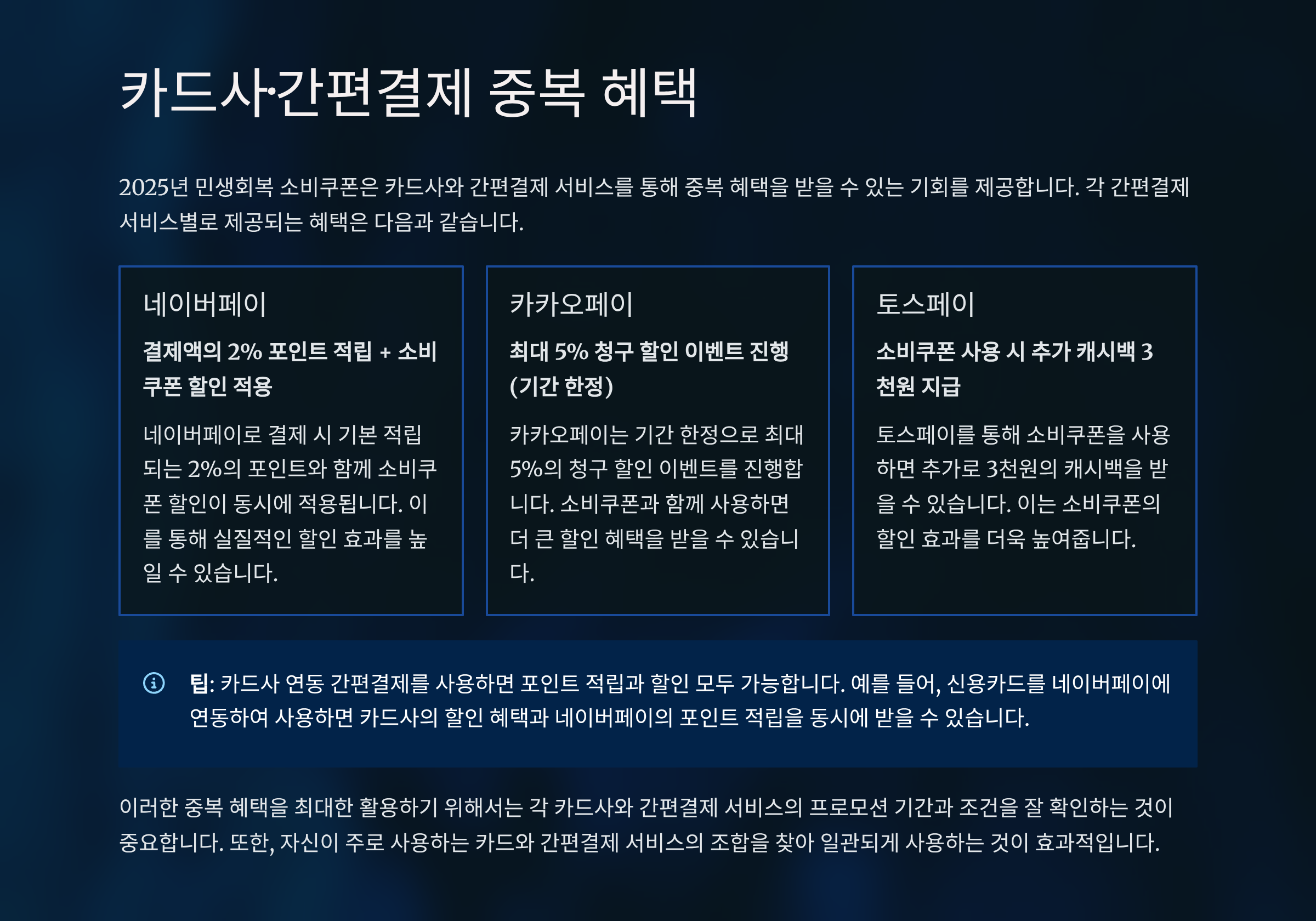 - 네이버페이: 결제액의 2% 포인트 적립 + 소비쿠폰 할인 적용