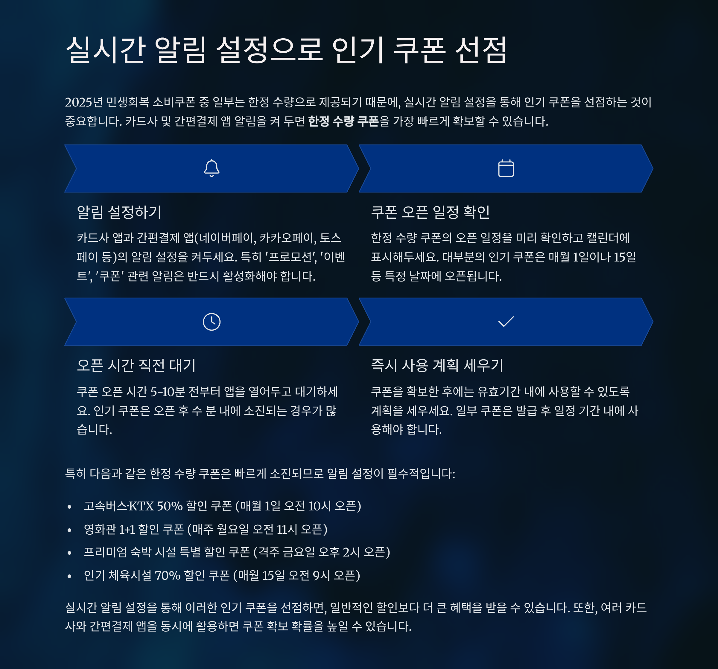 카드사 및 간편결제 앱 알림을 켜 두면 한정 수량 쿠폰을 가장 빠르게 확보할 수 있습니다.