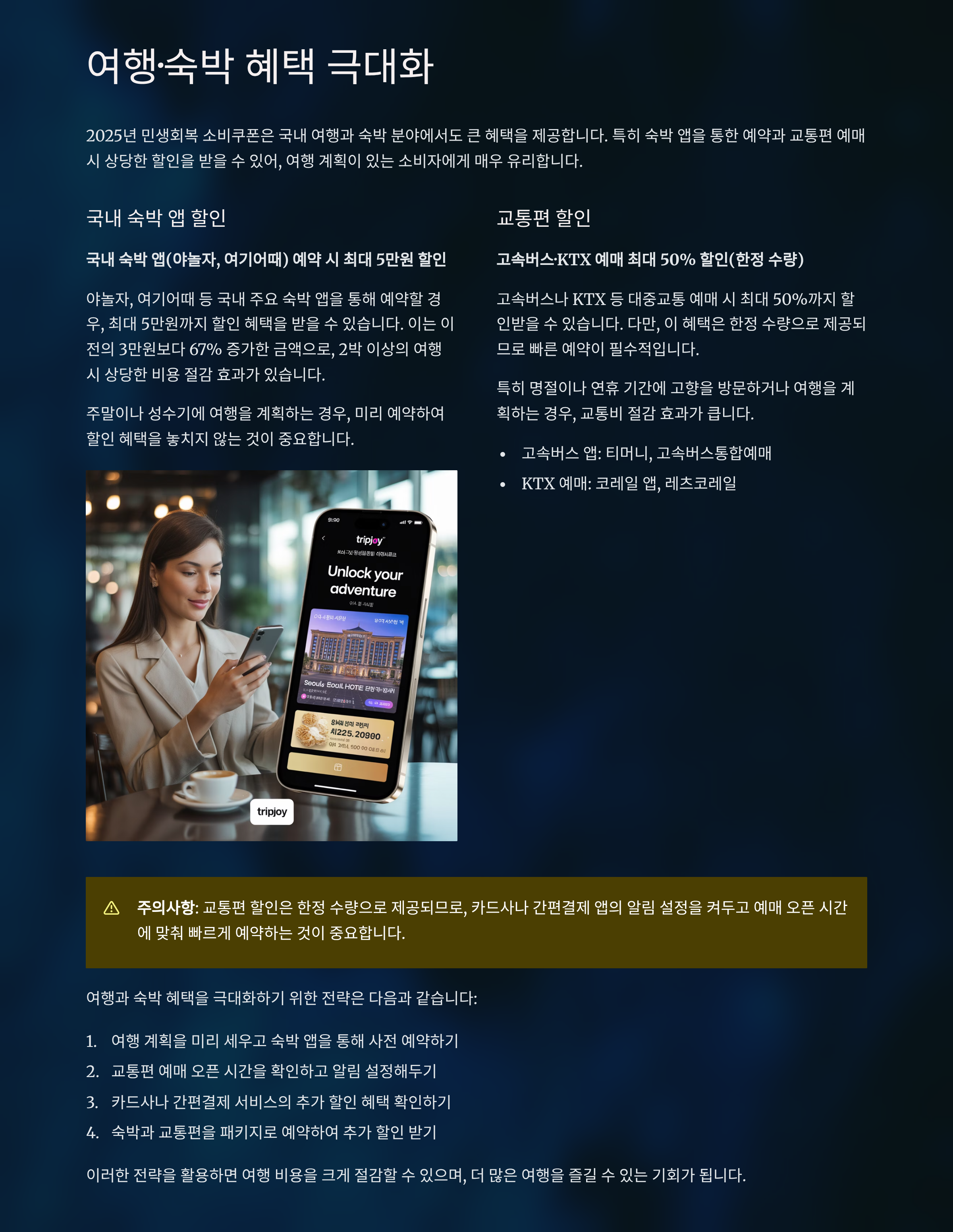 - 여행: 숙박 앱 최대 5만원 할인 + 고속버스 예매 50% 할인