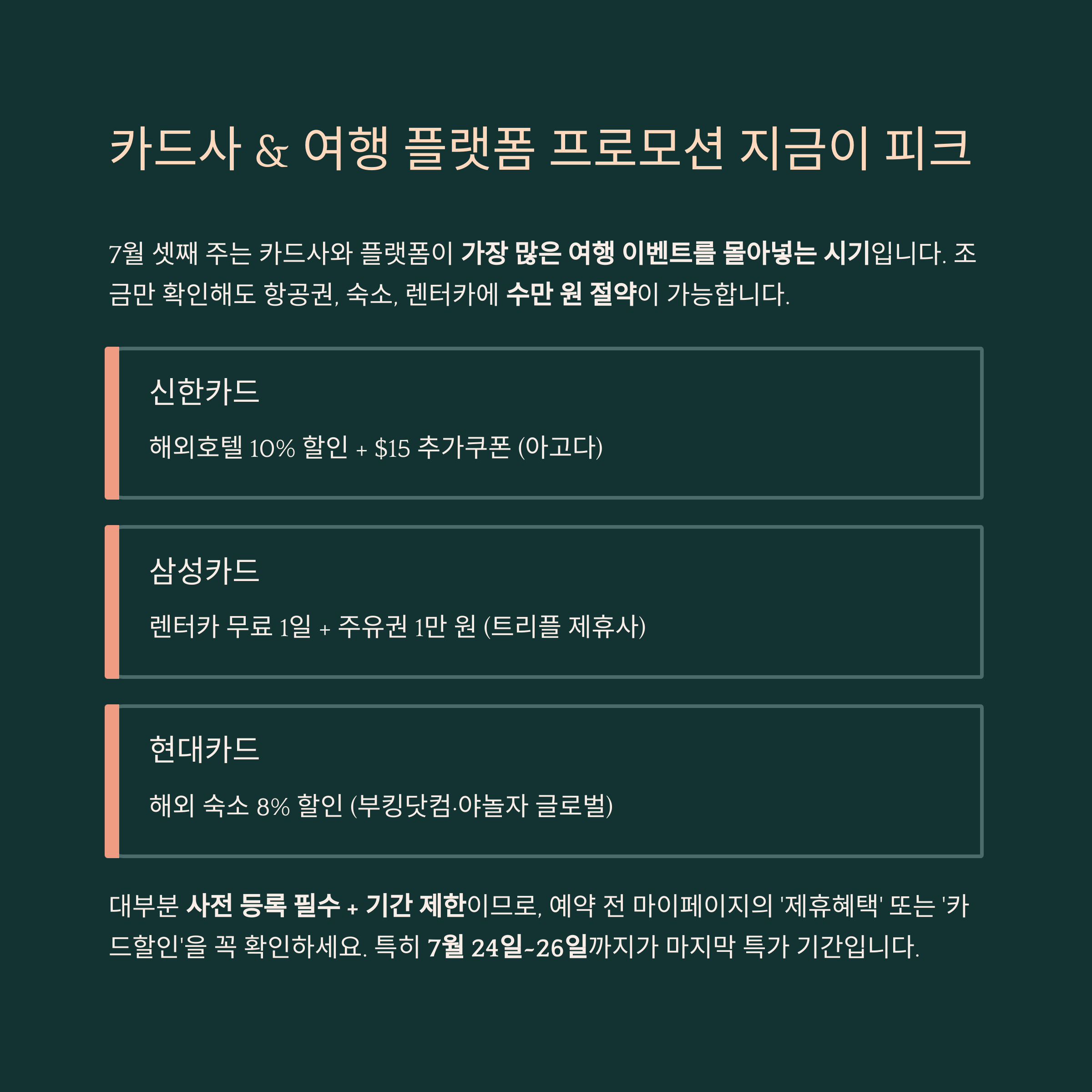7월 셋째 주는 카드사와 플랫폼이 가장 많은 여행 이벤트를 몰아넣는 시기입니다.