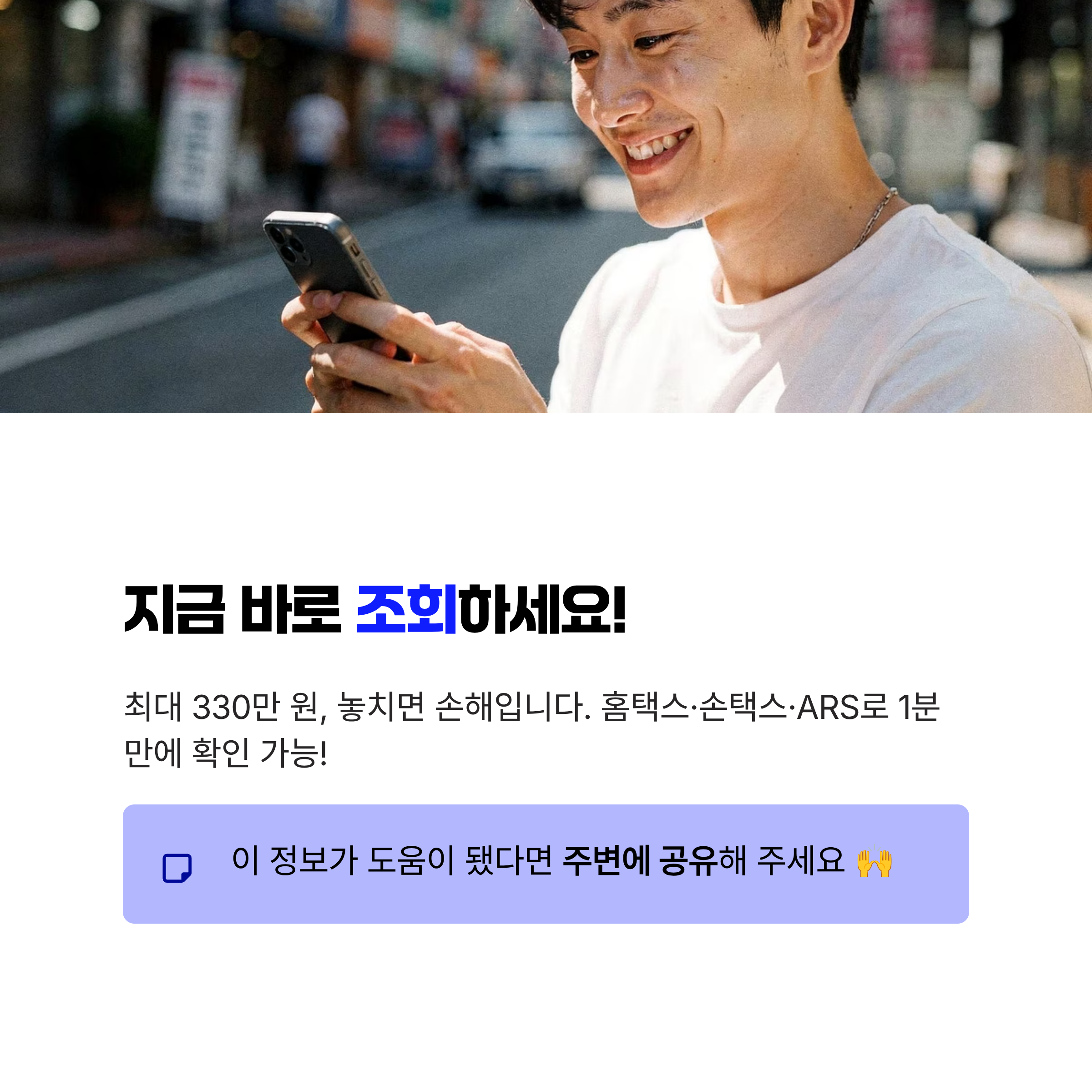 - 공식 홈페이지 확인: 본인의 정확한 대상 여부와 예상 지급액은 반드시 국세청 홈택스 공식 홈페이지를 통해 확인하시기 바랍니다. www.hometax.go.kr