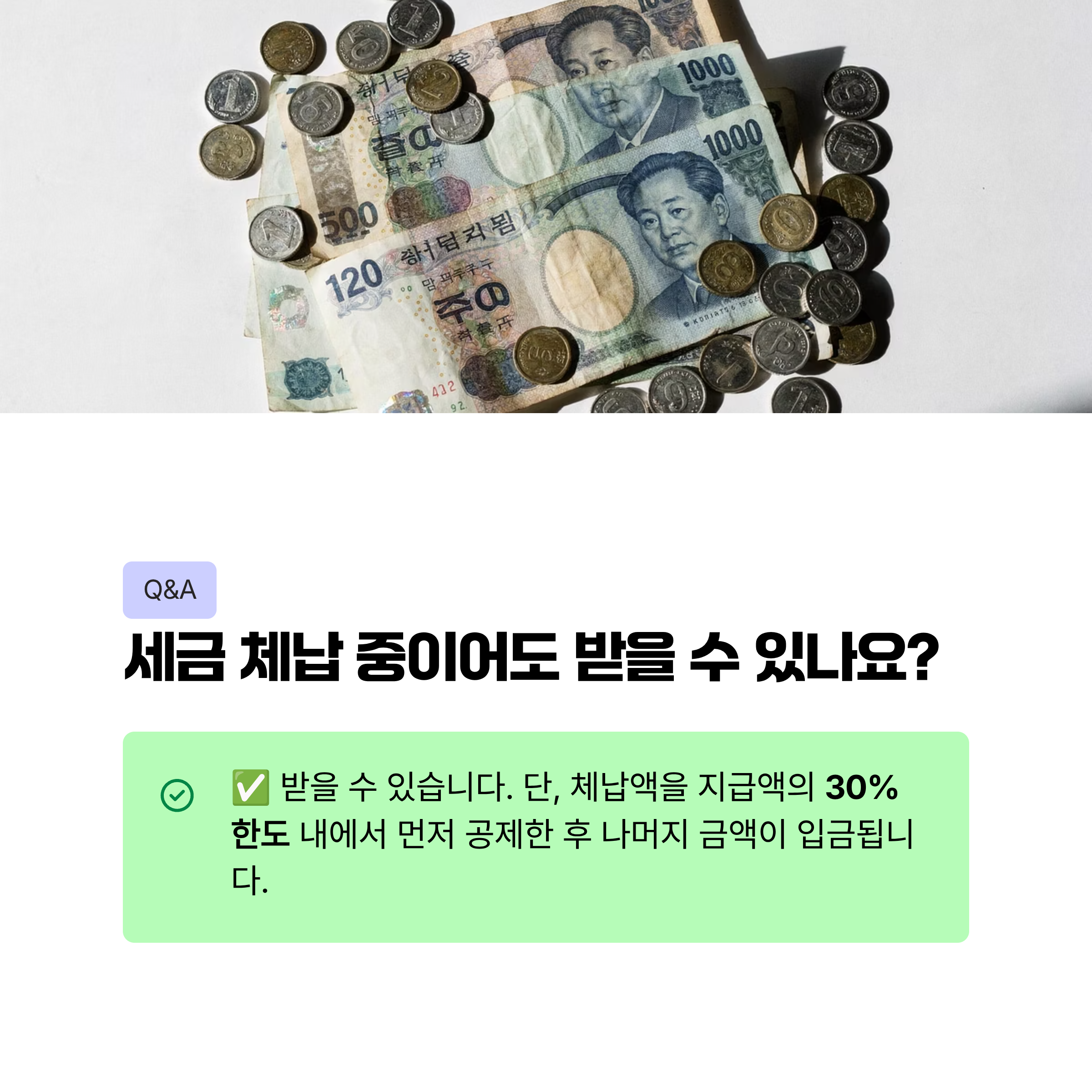 A. 받을 수 있습니다. 다만, 체납된 세금이 있다면 지급액의 **30% 한도 내에서 체납액을 먼저 충당(공제)**한 후 남은 금액을 입금해 줍니다.