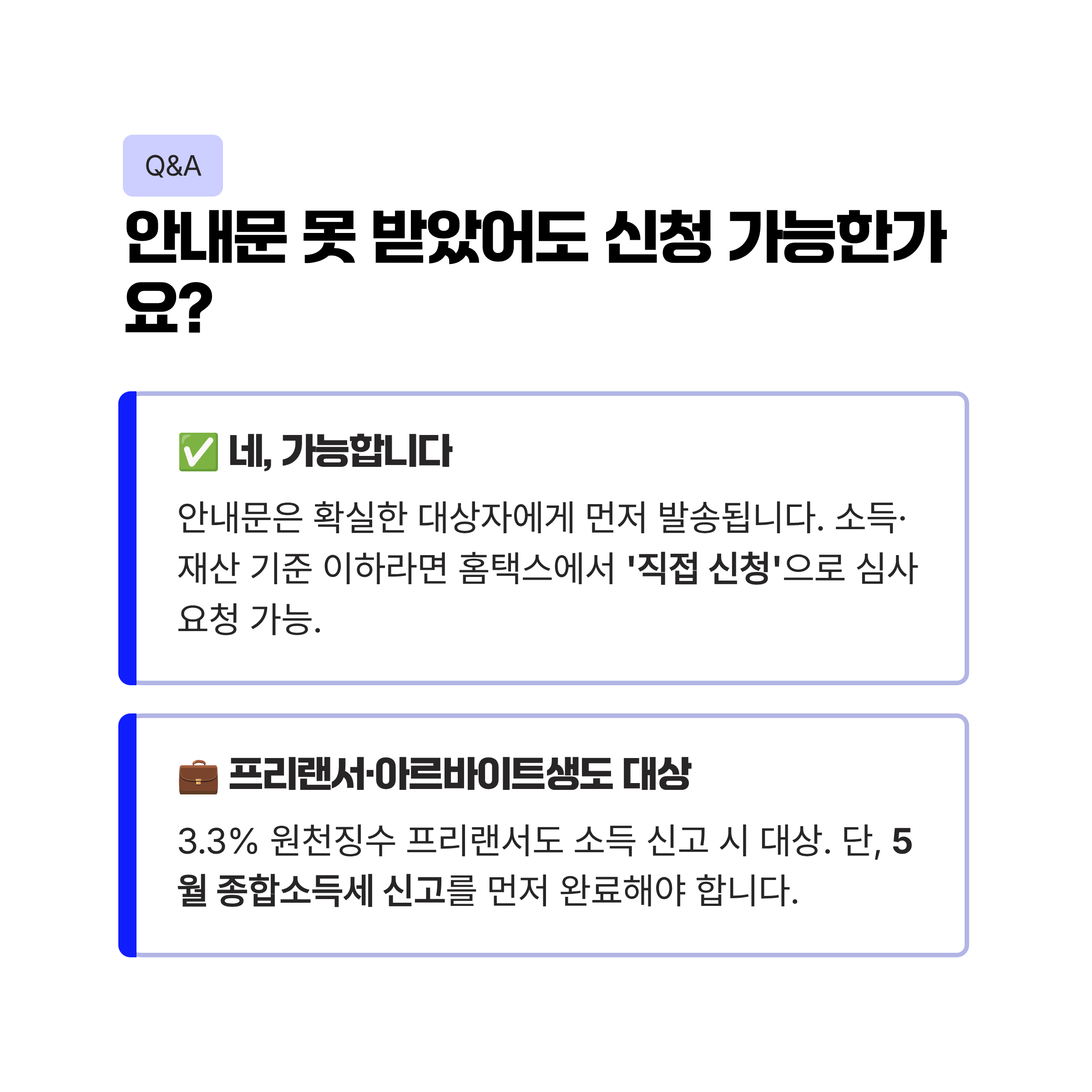 A. 네! 안내문은 국세청 데이터상 확실한 분들께 먼저 발송되는 것입니다. 본인의 소득과 재산이 기준 이하라면 홈택스에서 **'직접 신청'**을 눌러 심사를 요청할 수 있습니다.