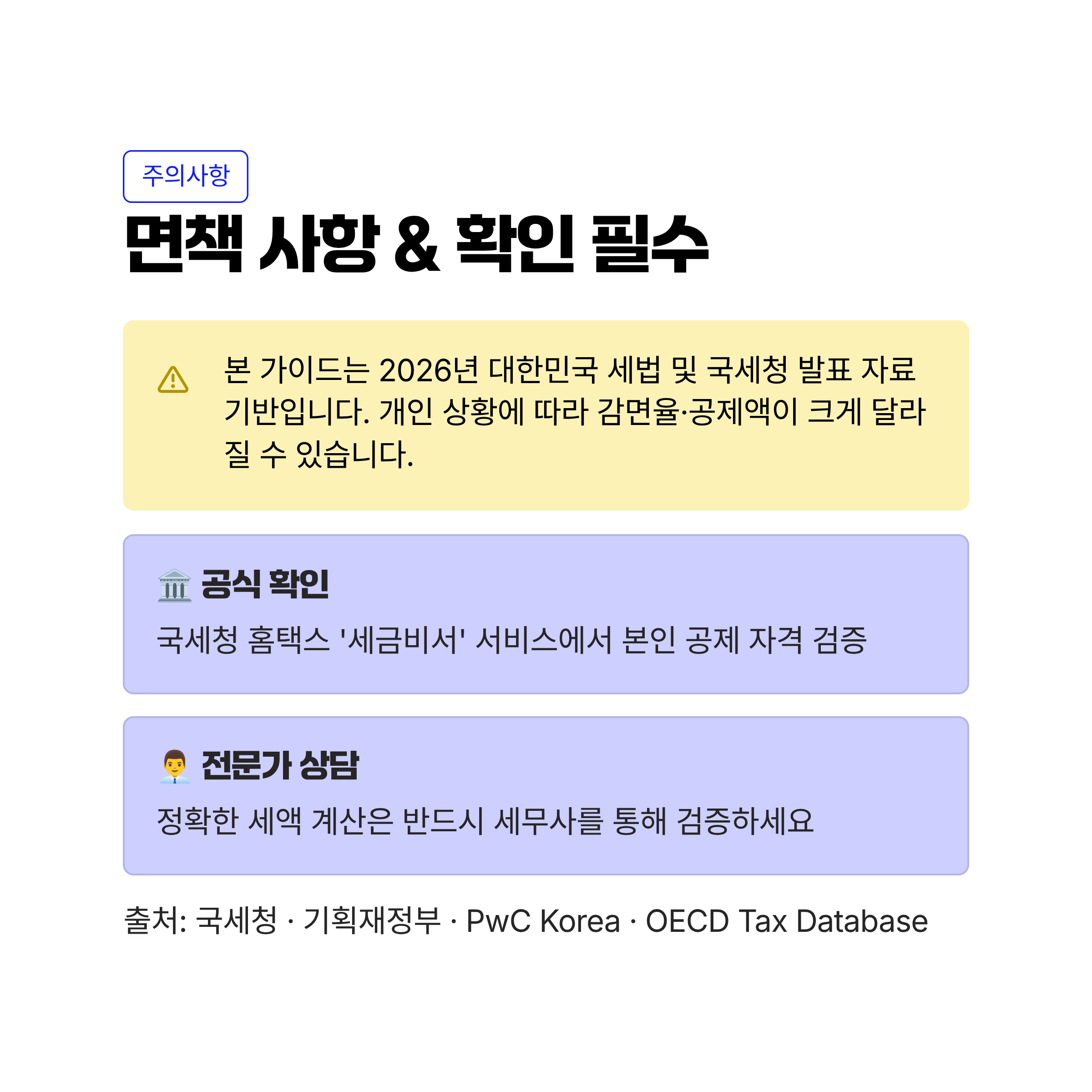 본 가이드는 2026년 시행 중인 대한민국 세법 및 국세청 발표 자료를 근거로 작성되었습니다.
