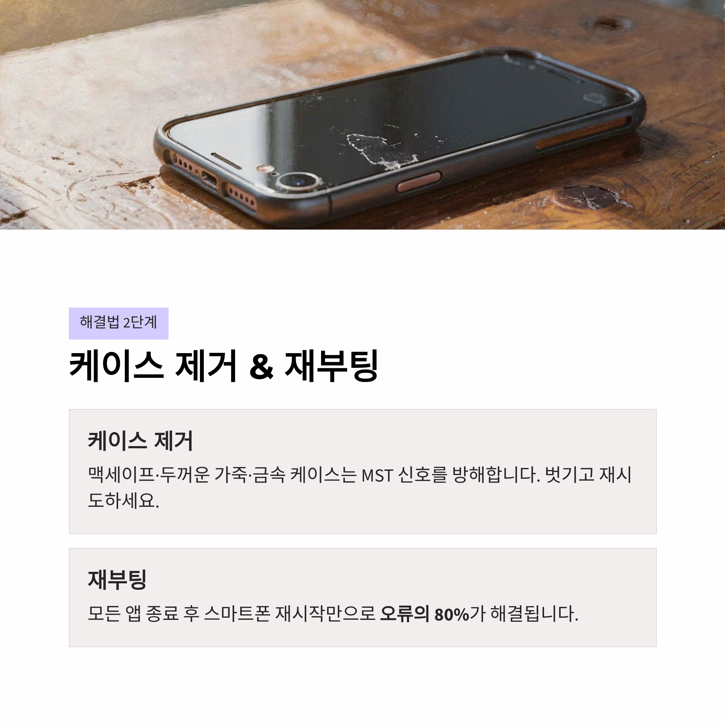최근 출시된 맥세이프 호환 케이스나 두꺼운 가죽 케이스, 금속 소재의 액세서리는 삼성페이의 마그네틱 보안 전송(MST) 신호를 방해합니다. 케이스를 벗긴 뒤 재시도해 보세요.