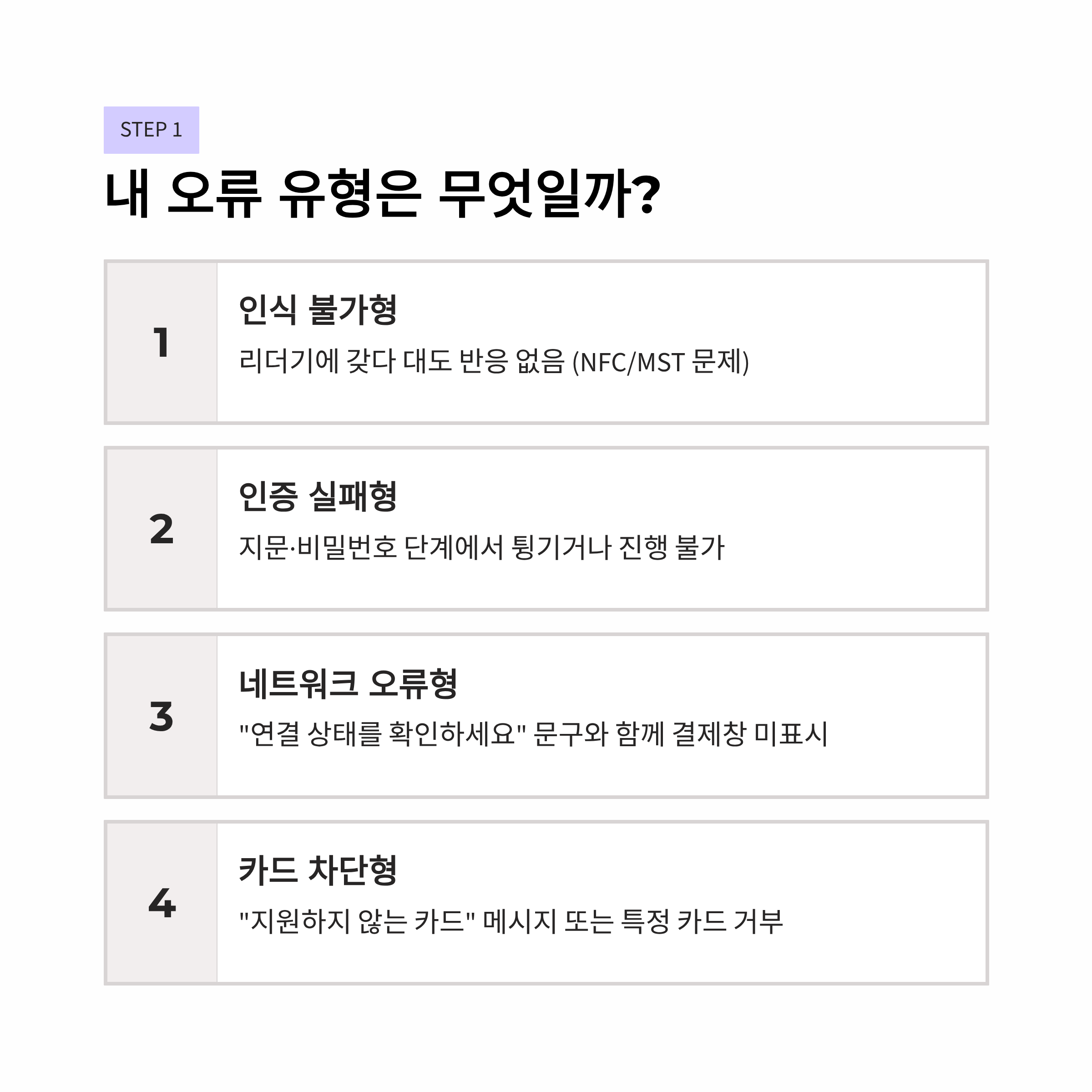 - 인식 불가형: 카드 리더기에 갖다 대도 반응이 전혀 없는 경우 (NFC/MST 센서 문제 가능성)