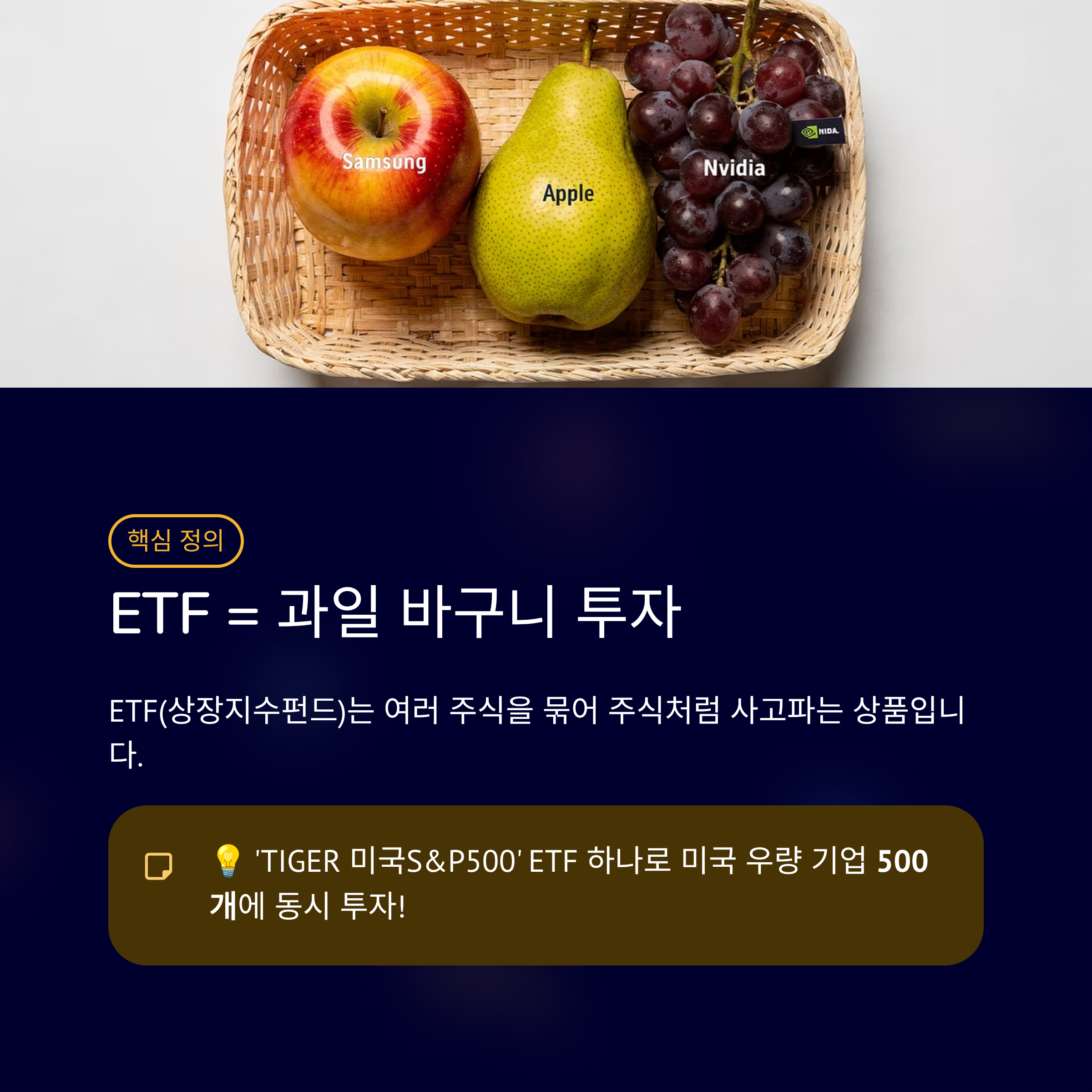 - 비유로 이해하기: 여러 가지 맛있는 과일이 담긴 **'과일 바구니'**를 떠올려 보세요. 사과(삼성전자), 배(애플), 포도(엔비디아)를 각각 따로 사려면 돈도 많이 들고 고르기도 힘들지만, 과일 바구니 하나를 사면 모든 과일을 조금씩 골고루 갖게 되는 것과 같습니다.