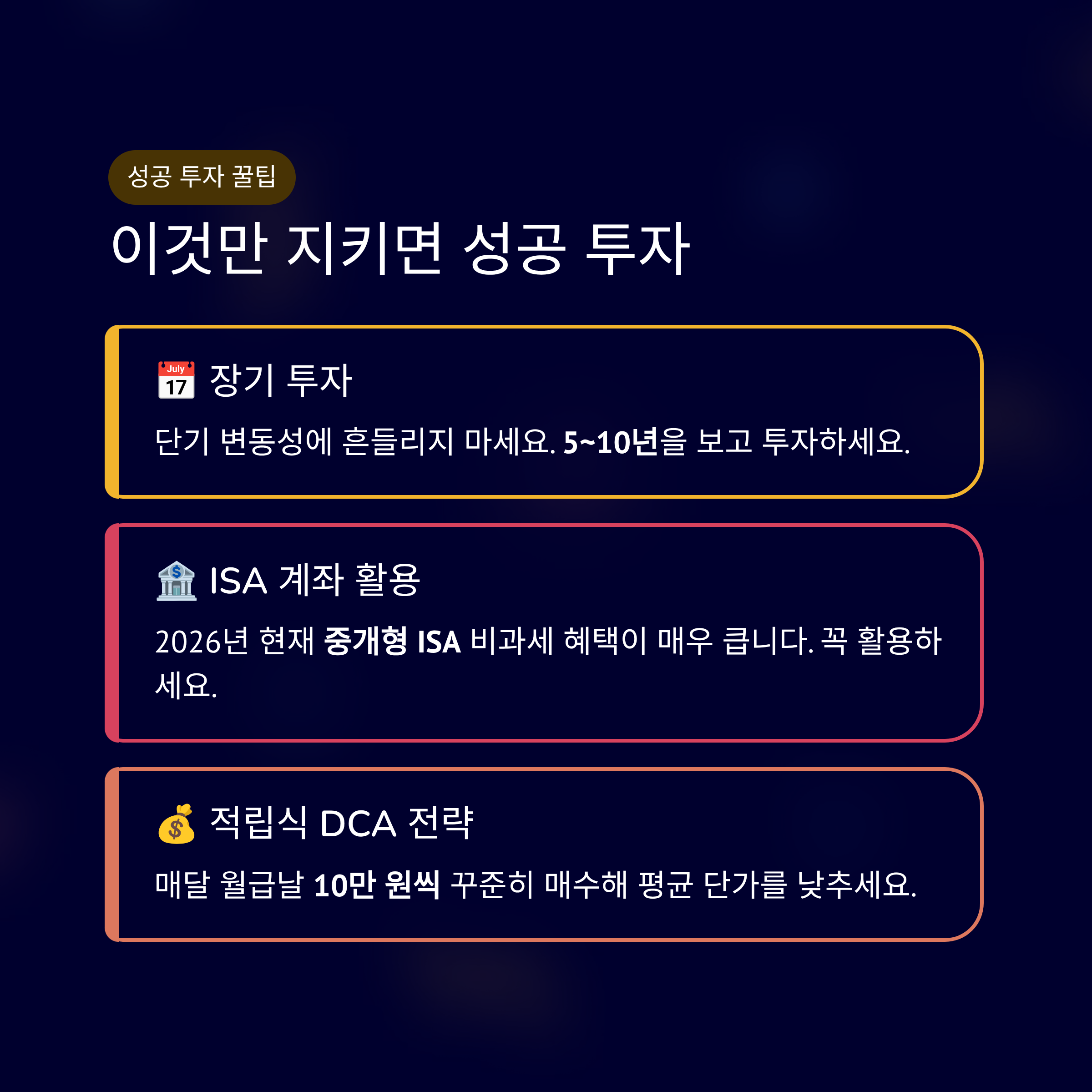 - 적립식 투자가 정답입니다: 한 번에 큰돈을 넣기보다 매달 월급날 10만 원씩 꾸준히 사는 것이 평균 매수 단가를 낮추는 가장 똑똑한 방법(DCA 전략)입니다.