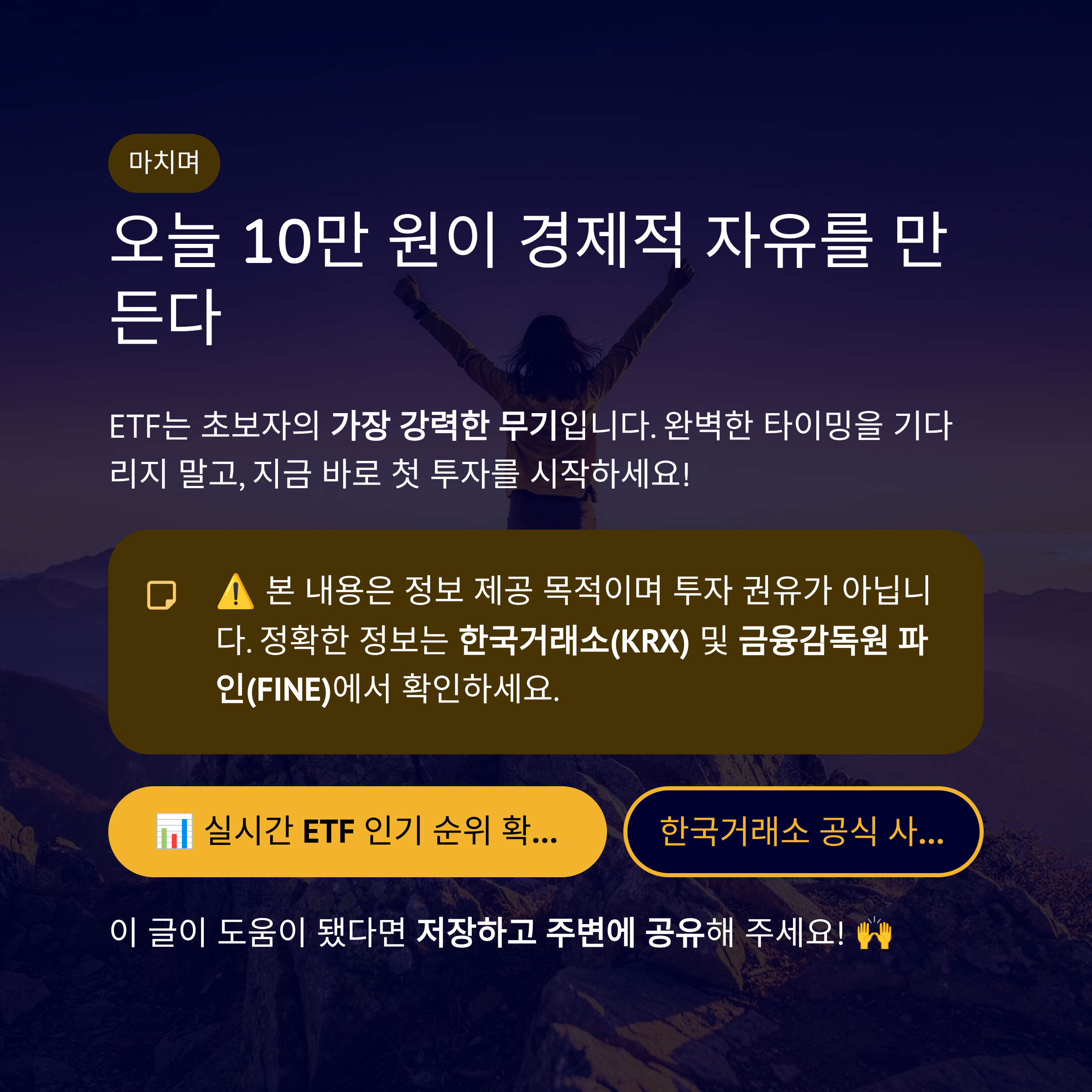 ETF는 어렵고 복잡한 주식 시장에서 초보자가 가질 수 있는 가장 강력한 무기입니다. 완벽한 타이밍을 기다리기보다, 오늘 10만 원으로 대표 ETF 1주를 사보는 그 '시작'이 여러분의 경제적 자유를 결정합니다.