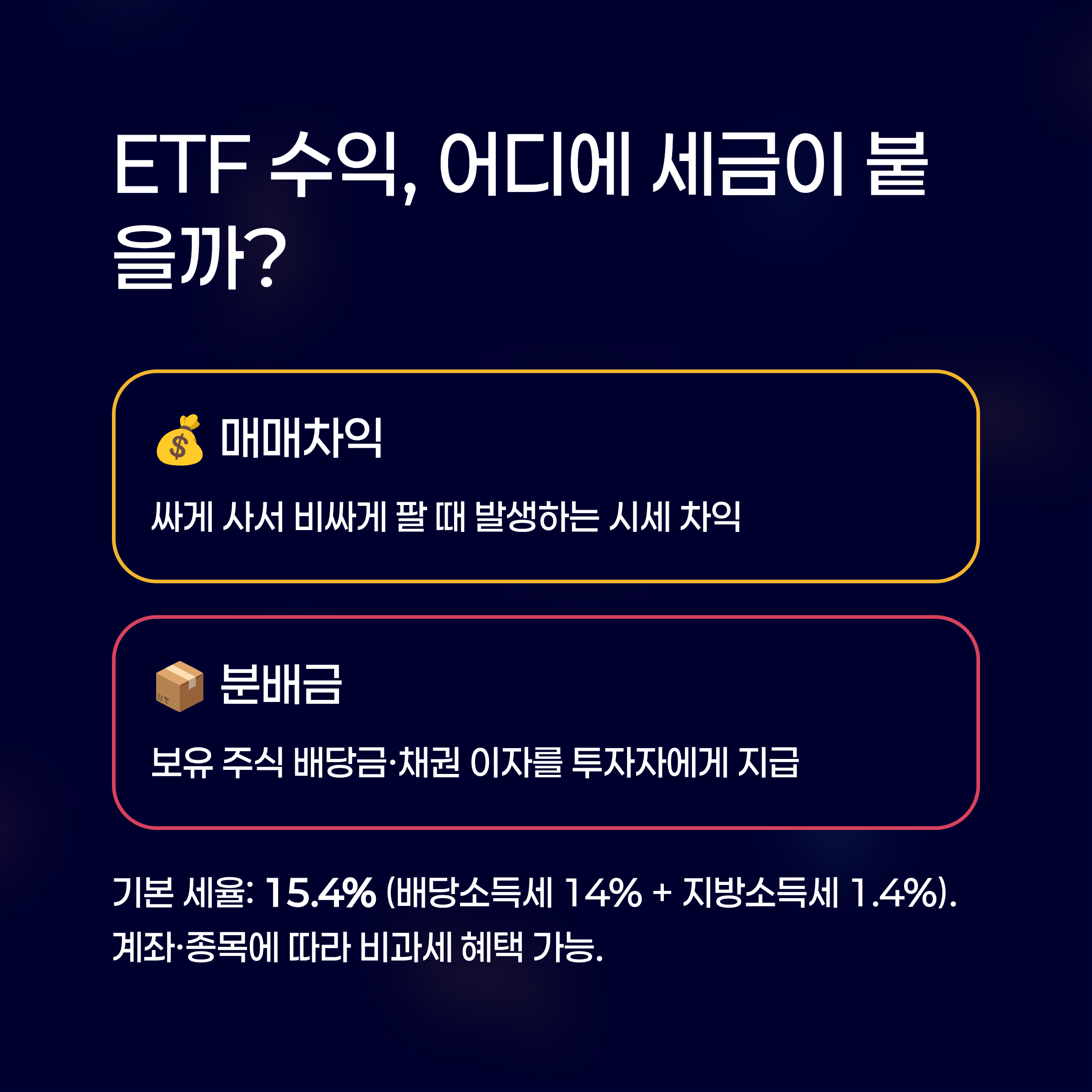 ETF 투자 시 발생하는 수익은 크게 두 가지로 나뉘며, 각각 적용되는 세금 체계가 다릅니다.