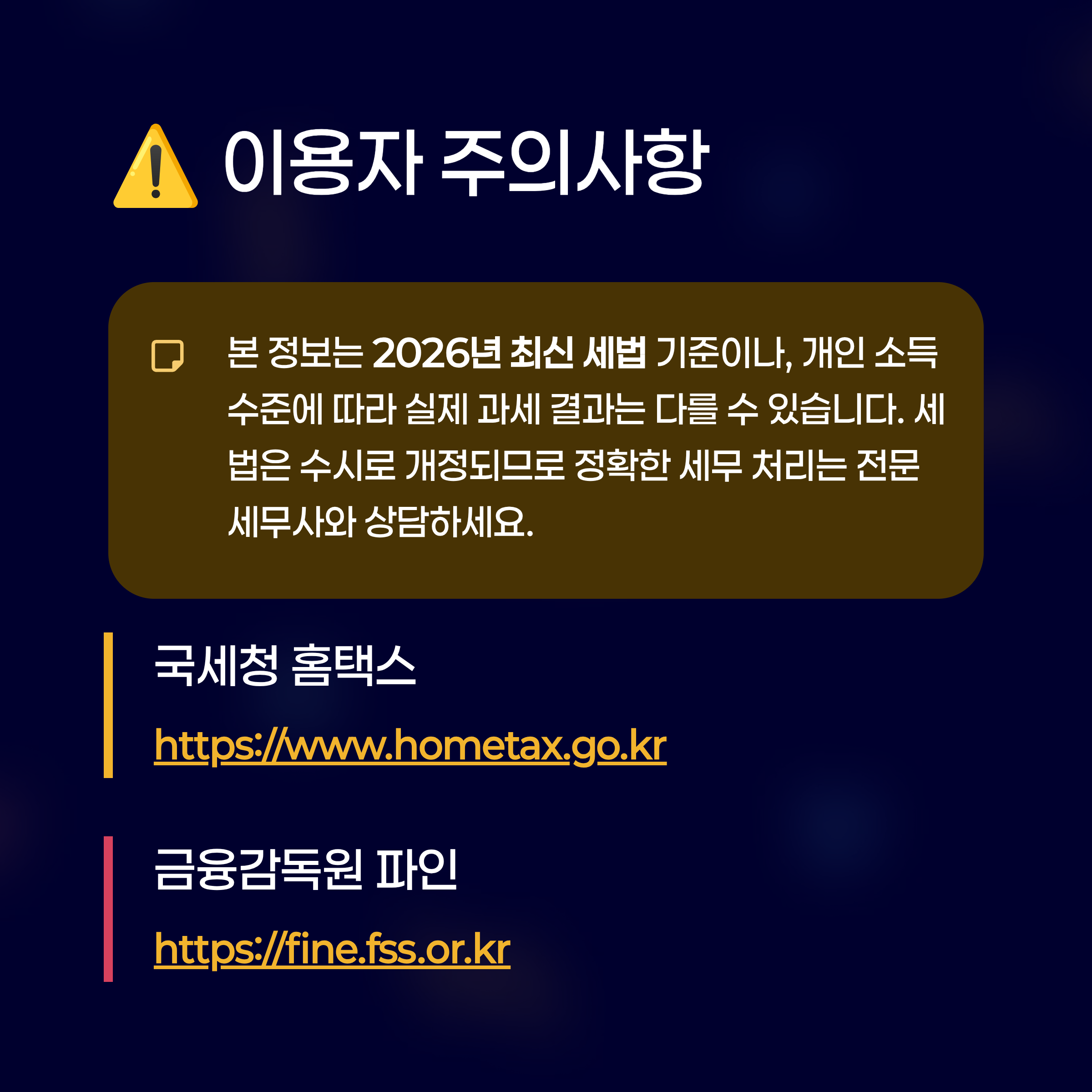 본 정보는 2026년 최신 세법 및 데이터를 기반으로 작성되었으나, 개개인의 소득 수준과 상황에 따라 실제 과세 결과는 달라질 수 있습니다. 세법은 수시로 개정될 수 있으므로 정확한 세무 처리는 반드시 국세청 홈페이지나 전문 세무사와 상담하시기 바랍니다.