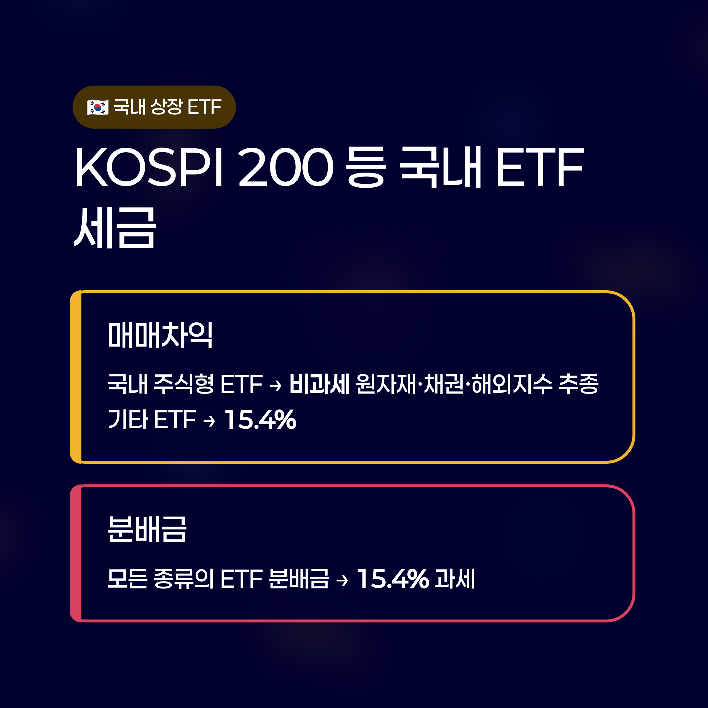 - 매매차익: 국내 주식형 ETF는 매매차익에 대해 비과세입니다. 단, 원자재, 채권, 해외 지수를 추종하는 '기타 ETF'는 15.4%의 세금이 붙습니다.