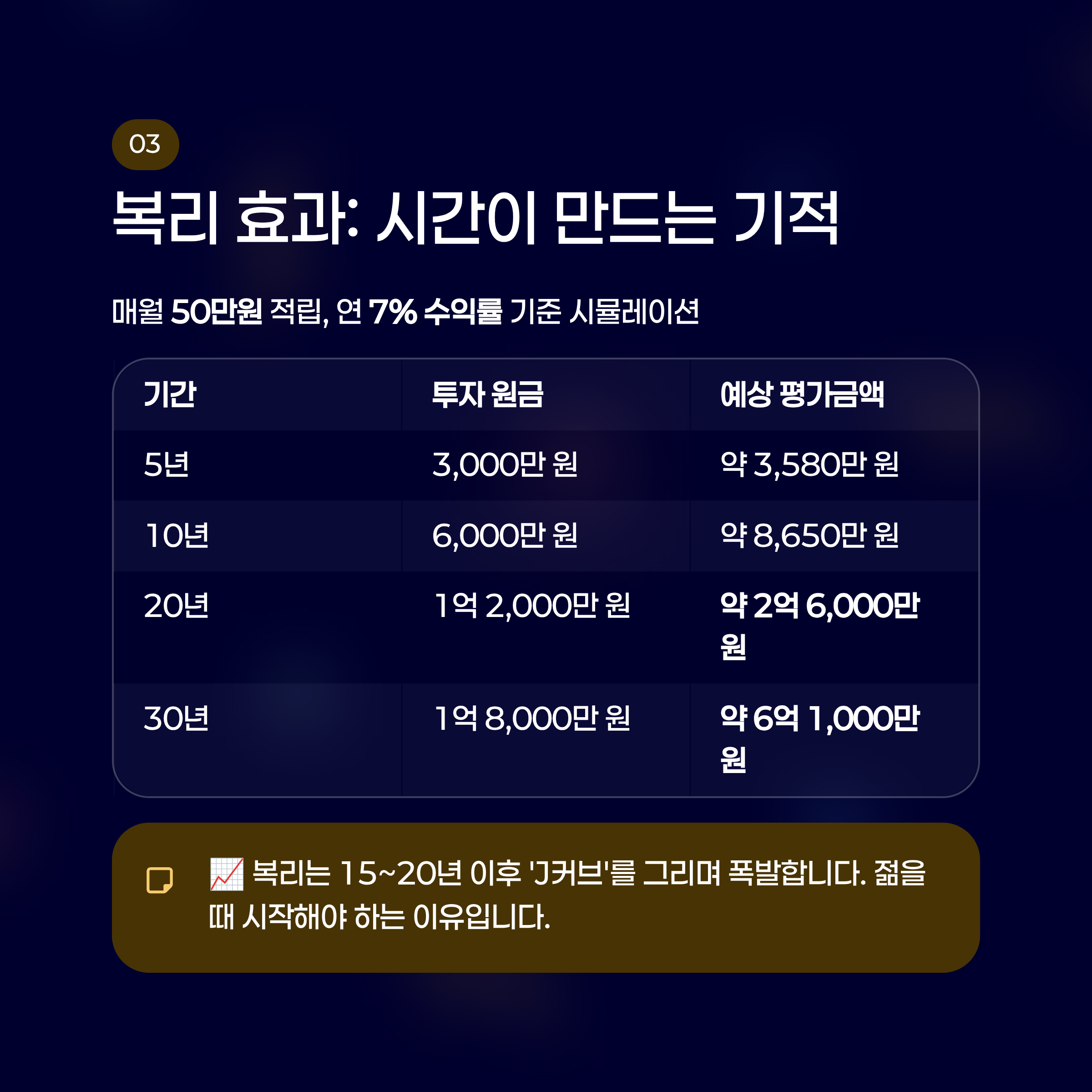 이처럼 복리 효과는 초반에는 미미해 보이지만, 15~20년이 넘어가는 시점부터 'J커브'를 그리며 폭발합니다. 젊을 때 시작해야 하는 이유가 바로 여기에 있습니다.