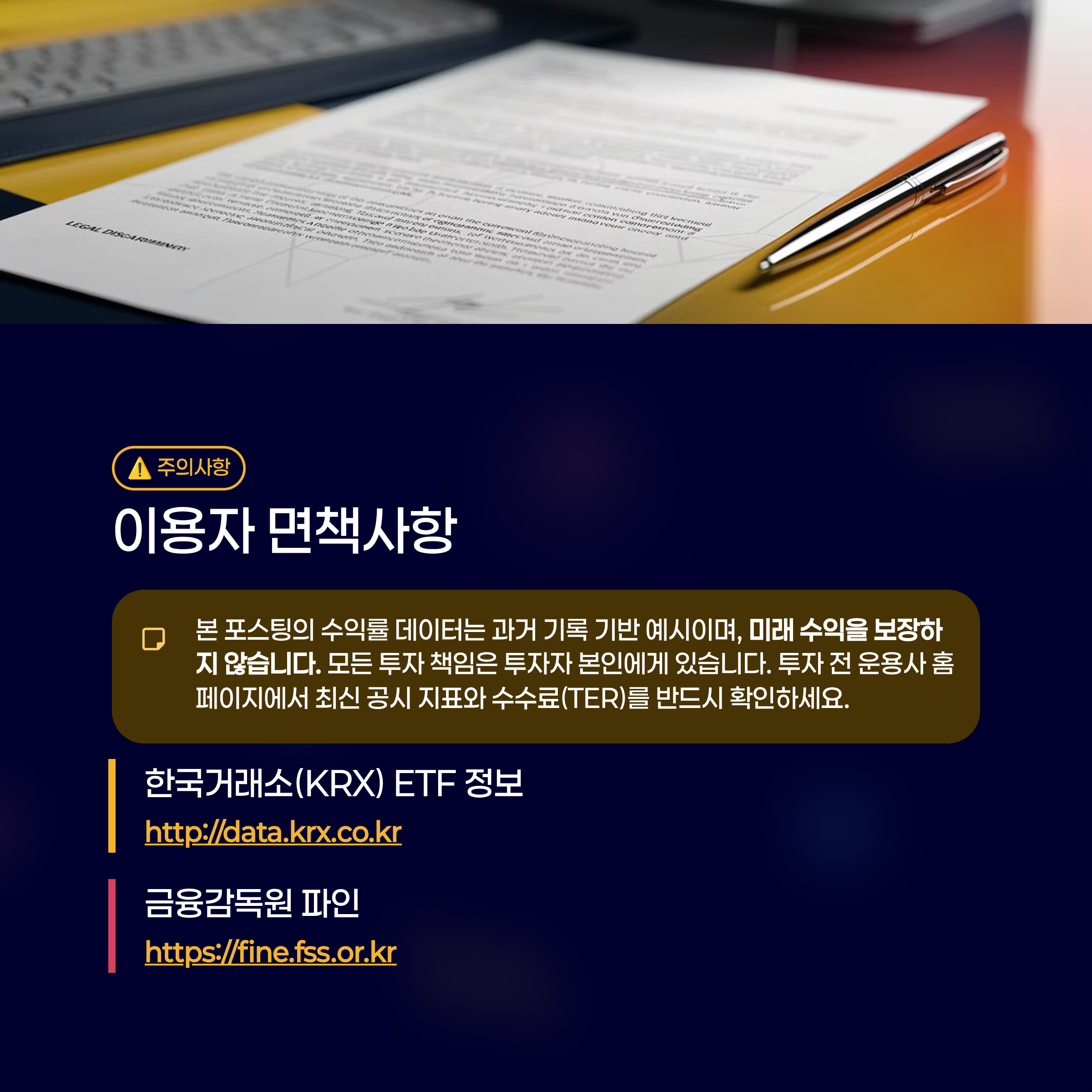 본 포스팅에서 제공하는 수익률 데이터는 과거의 기록을 바탕으로 한 예시이며, 미래의 수익을 보장하지 않습니다. 모든 투자의 책임은 투자자 본인에게 있습니다. 투자 전 반드시 운용사 홈페이지에서 최신 공시 지표와 수수료(TER)를 확인하시기 바랍니다.