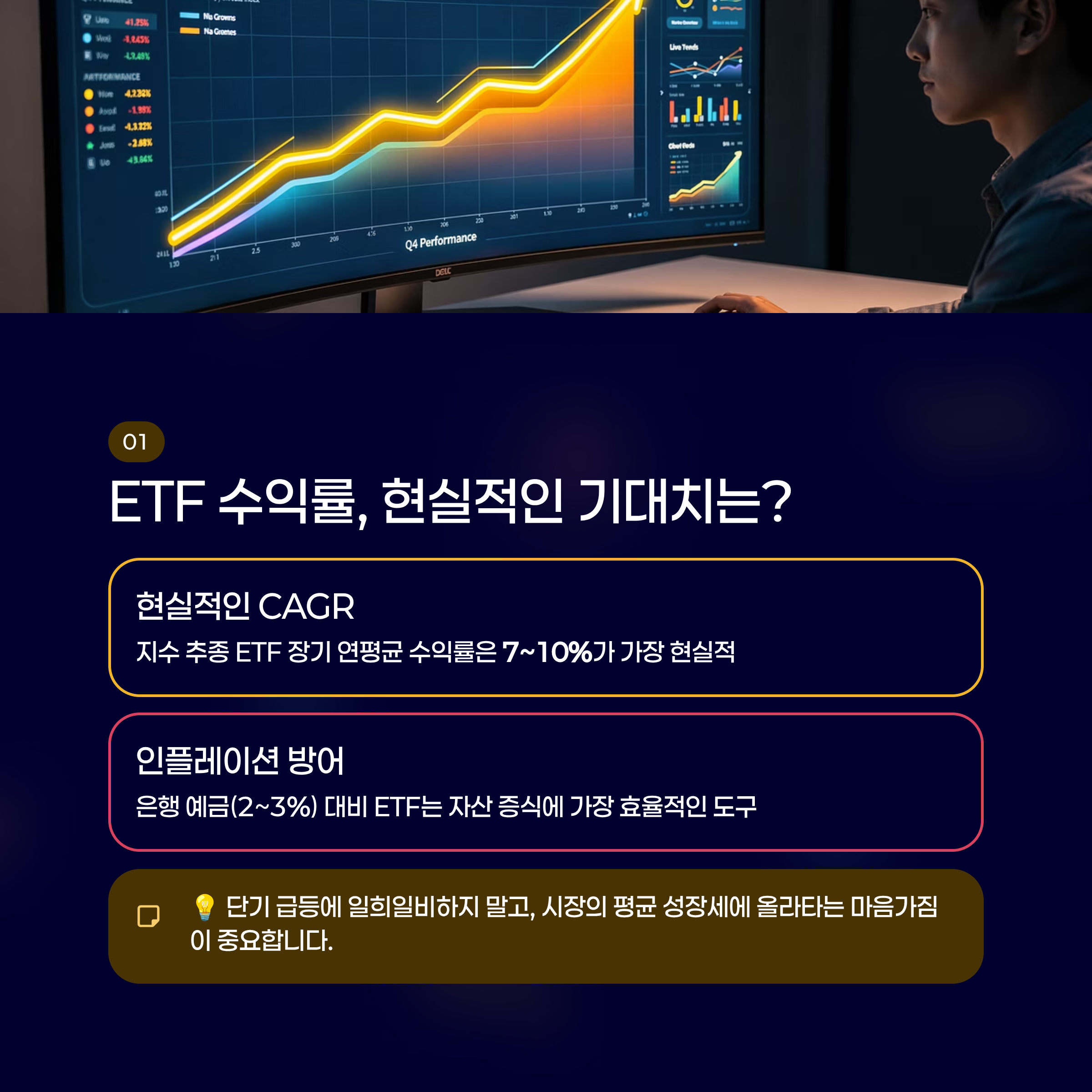 - 물가 상승률 대비: 은행 예금이 연 2~3% 수준일 때, ETF는 인플레이션을 방어하고 자산을 증식시킬 수 있는 가장 효율적인 도구입니다.