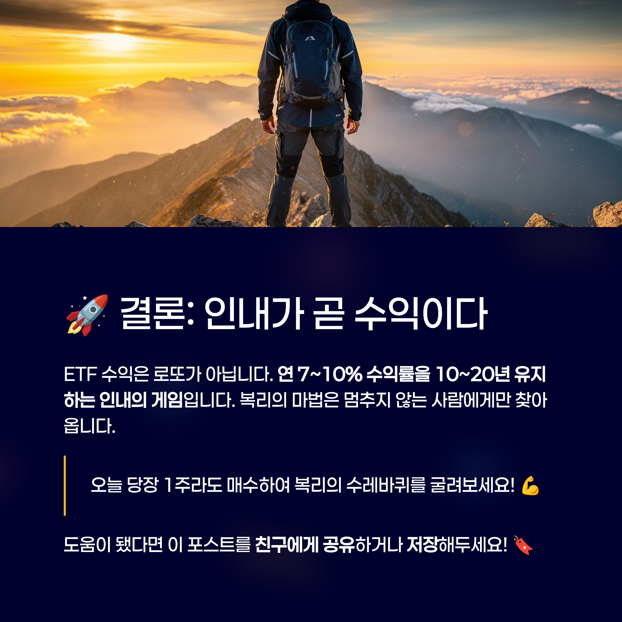ETF 수익은 로또가 아닙니다. **연 7~10%의 수익률을 10년, 20년 유지하는 '인내의 게임'**입니다. 복리의 마법은 중간에 멈추지 않는 사람에게만 찾아옵니다. 오늘부터 당장 1주라도 매수하여 복리의 수레바퀴를 굴려보세요!