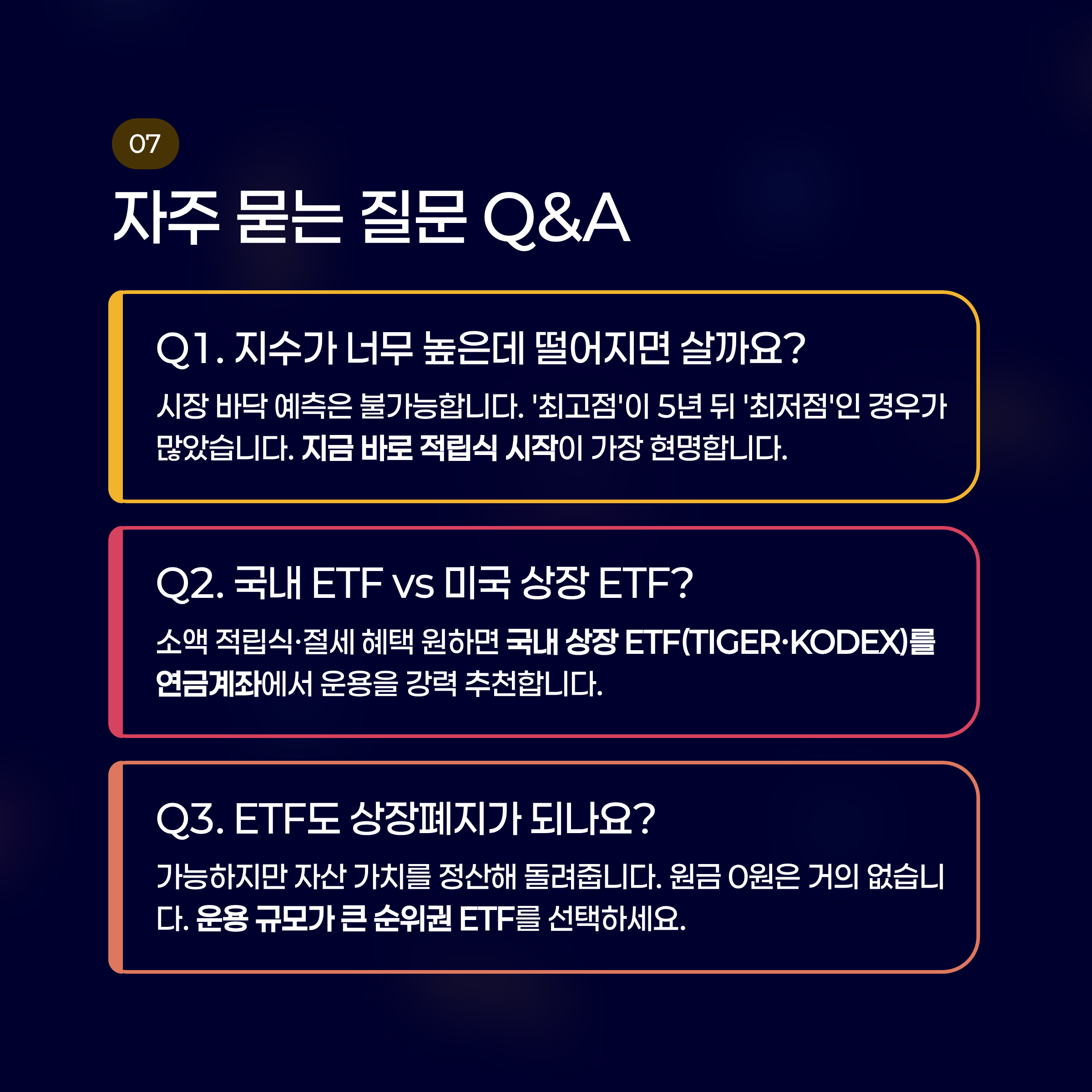 - 주의점: 기술주 중심이라 하락장에서 하락 폭이 큽니다. 공격적인 성향의 투자자에게 유리합니다.