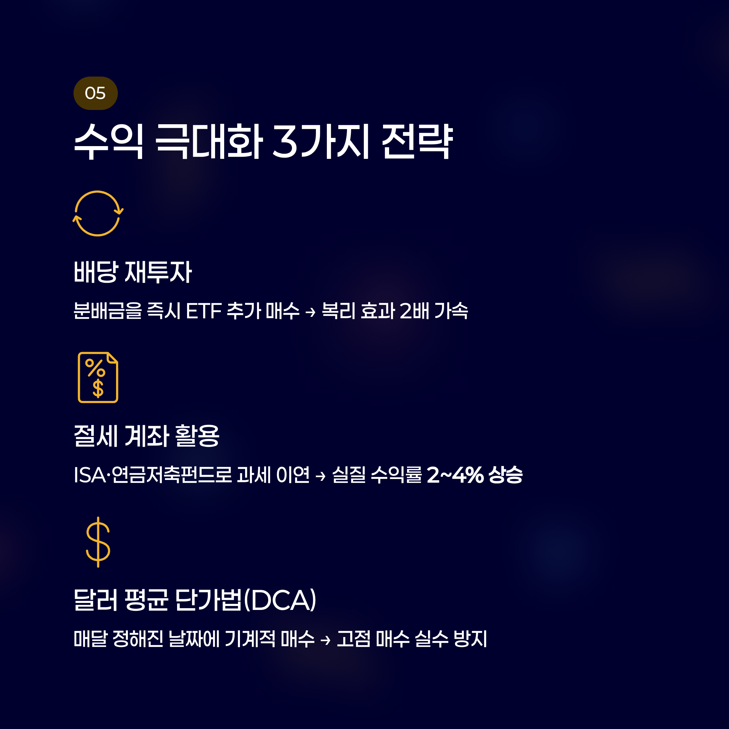 - 달러 평균 단가법(DCA): 가격에 상관없이 매달 정해진 날짜에 기계적으로 매수하세요. 고점에서 많이 사고 저점에서 적게 사는 실수를 방지해 줍니다.