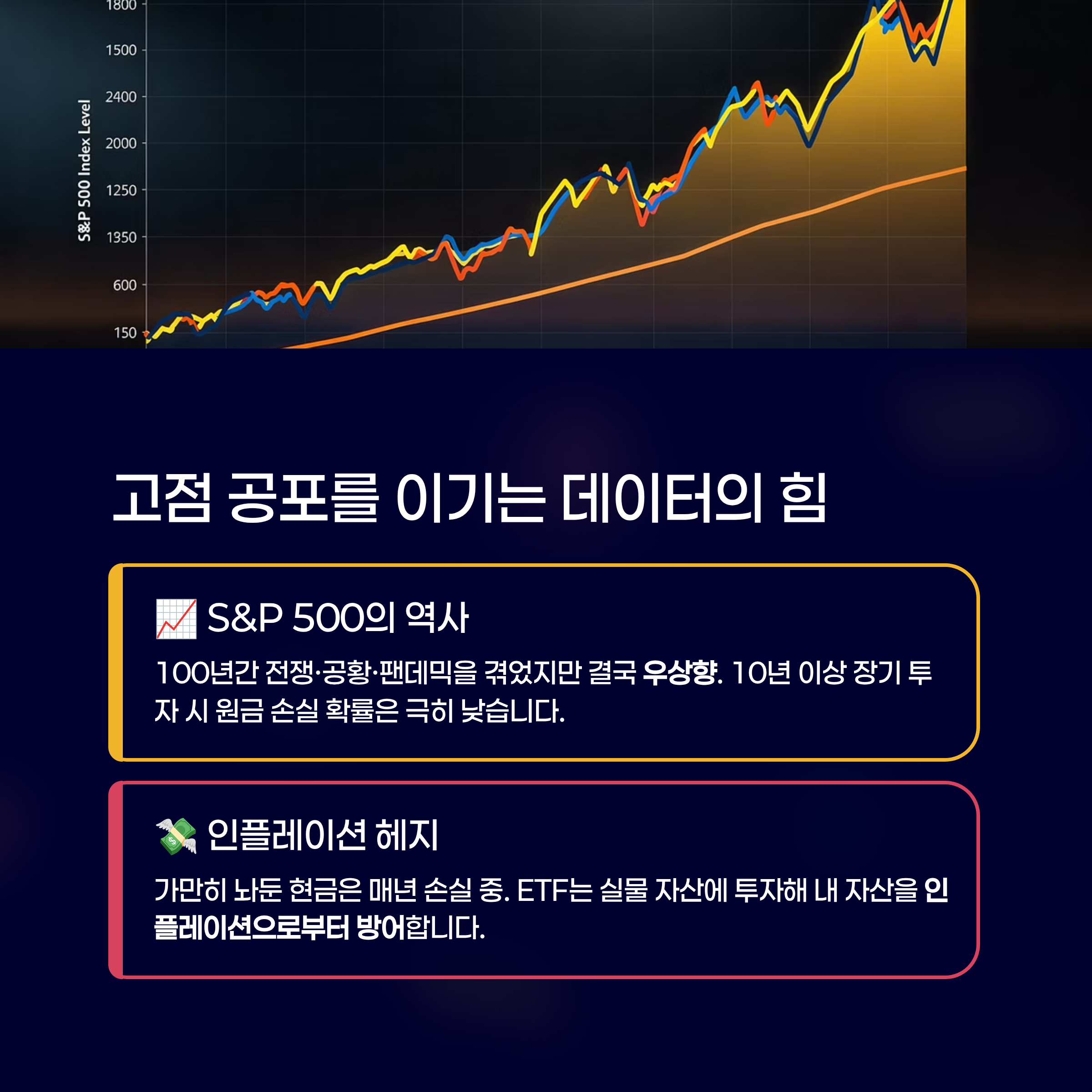 - 인플레이션 헤지: 화폐 가치는 매년 하락합니다. 가만히 놔둔 현금은 손실 중입니다. ETF는 실물 자산(기업)에 투자함으로써 인플레이션으로부터 내 자산을 방어하는 가장 효율적인 수단입니다.