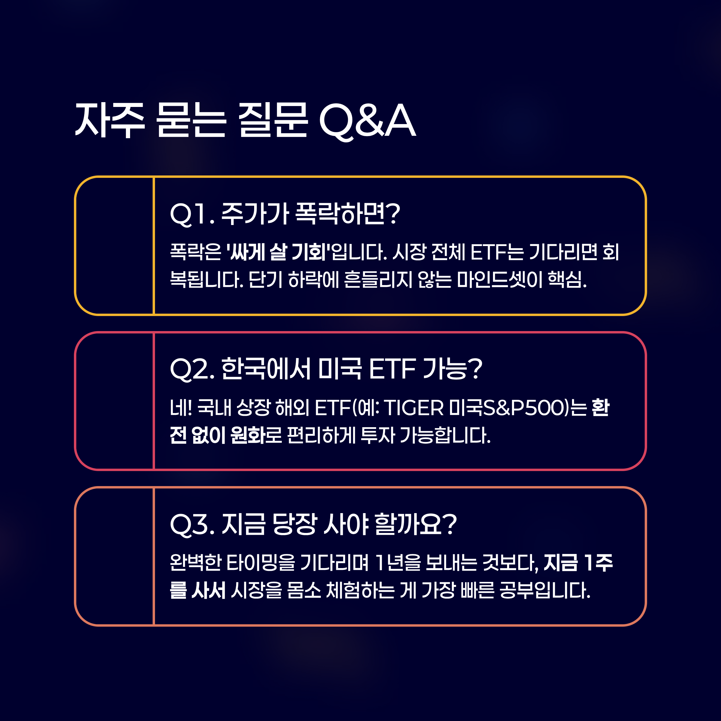A1. 폭락은 오히려 '싸게 살 기회'입니다. 시장 전체에 투자하는 ETF라면 기다리면 회복됩니다. 단기 하락에 일희일비하지 않는 마인드셋이 중요합니다.