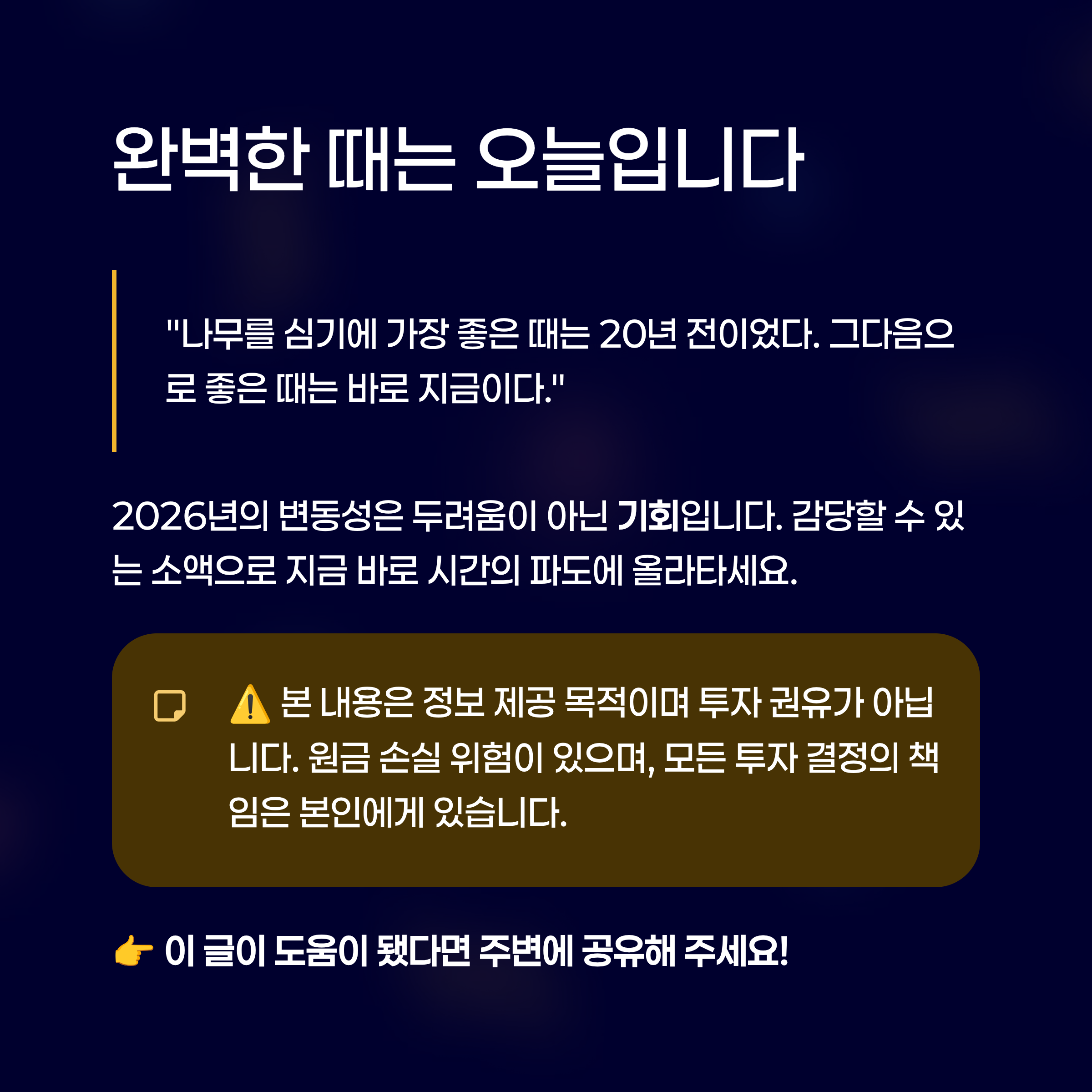 투자도 마찬가지입니다. ETF는 여러분의 자산을 대신 관리해 주는 가장 똑똑한 비서입니다. 2026년의 변동성은 두려움의 대상이 아니라, 자산을 불려 나갈 기회의 장입니다. 무리한 금액이 아닌, 본인이 감당할 수 있는 소액으로 지금 바로 '시간의 파도'에 올라타세요.
