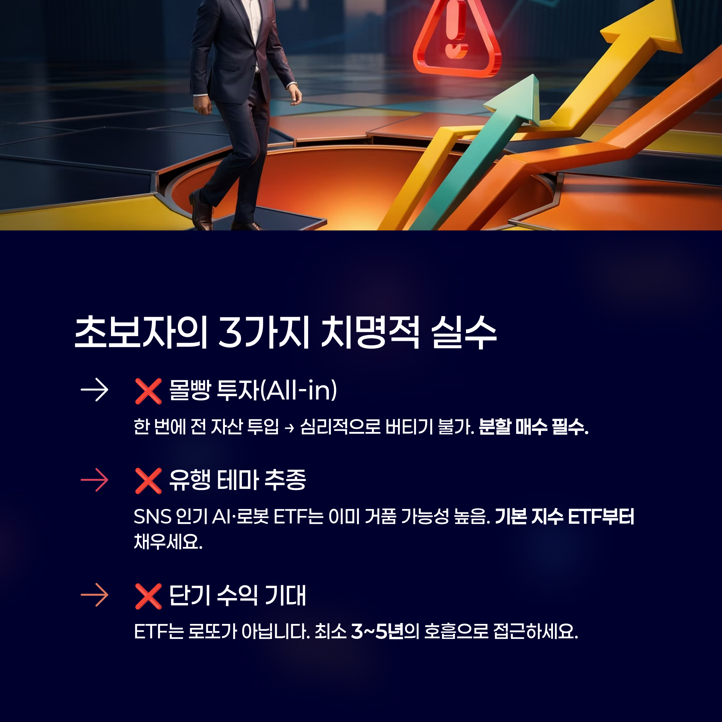 - 단기 수익 기대: ETF는 로또가 아닙니다. 1~2개월 만에 수익을 보려 하기보다 최소 3~5년의 호흡으로 접근해야 합니다.