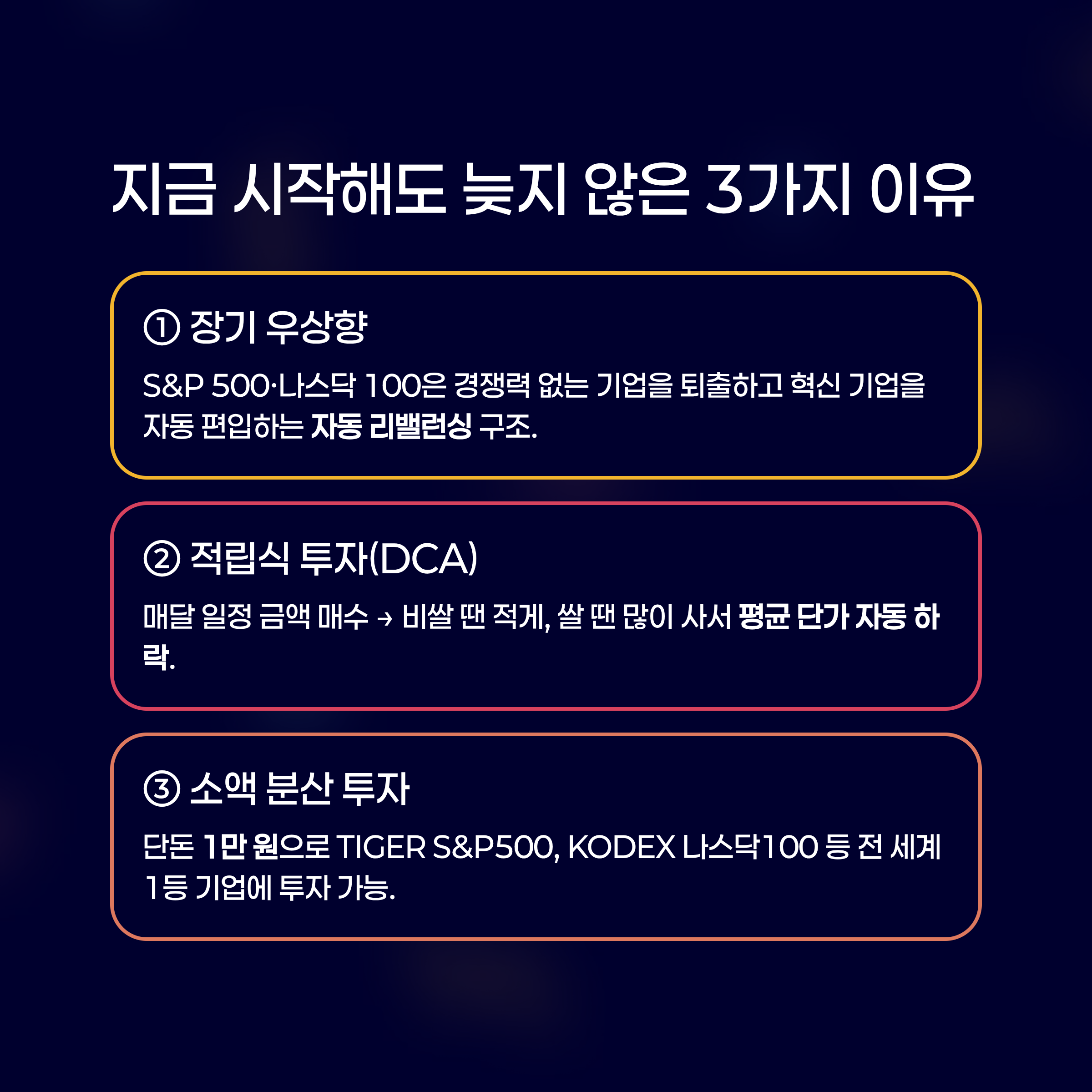 개별 기업은 망할 수 있지만, 국가의 경제와 시장 전체가 영원히 하락할 수는 없습니다. 미국 S&P 500이나 나스닥 100은 경쟁력이 떨어진 기업은 퇴출하고 혁신 기업을 새로 담는 '자동 리밸런싱' 기능을 갖추고 있습니다.