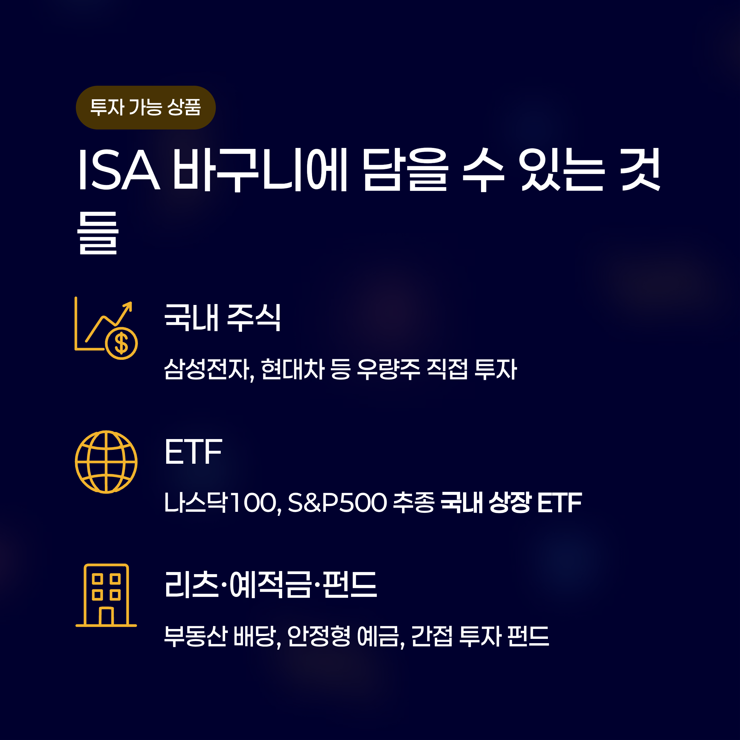 - ISA 계좌로 투자할 수 있는 상품들